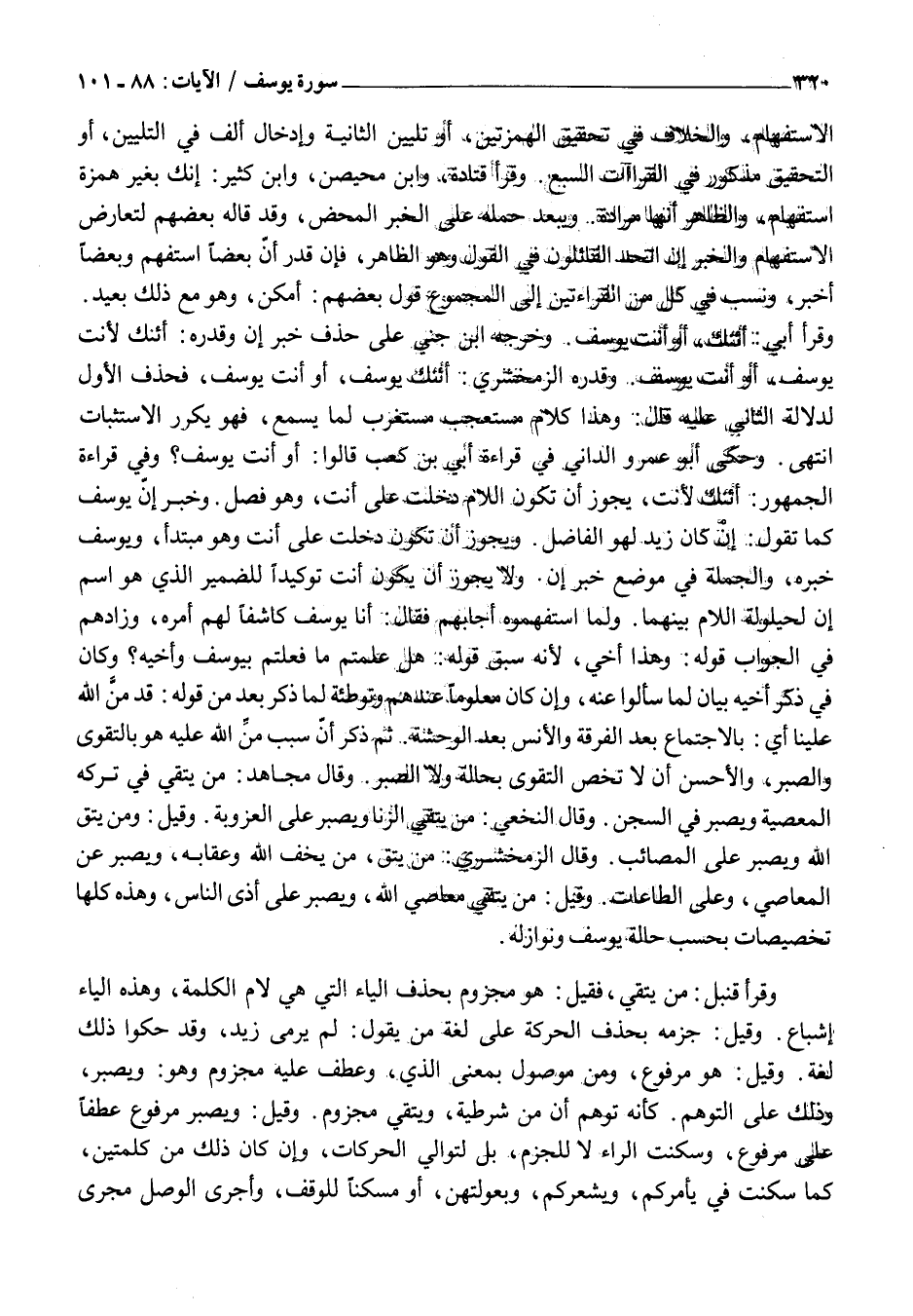 وقرأ أبي: أإنك، أَوْ أَنْتَ يُوسُفُ. وَخَرَّجَهُ ابْنُ جِنِّي عَلَى حَذْفِ خبر إن وقدره: أإنك لَأَنْتَ يُوسُفُ، أَوْ أَنْتَ يوسف. وقدره الزمخشري: أإنك يُوسُفُ، أَوْ أَنْتَ يُوسُفُ، فَحَذَفَ الْأَوَّلَ لِدَلَالَةِ الثَّانِي عَلَيْهِ قَالَ: وَهَذَا كَلَامٌ مُسْتَعْجَبٌ مُسْتَغْرَبٌ لِمَا يُسْمَعُ، فَهُوَ يُكَرِّرُ الِاسْتِثْبَاتَ انْتَهَى. وَحَكَى أَبُو عَمْرٍو الدَّانِيُّ فِي قِرَاءَةِ أُبَيِّ بْنِ كَعْبٍ قَالُوا: أَوَ أَنْتَ يُوسُفُ؟ وَفِي قِرَاءَةِ الْجُمْهُورِ: أإنك لَأَنْتَ، يَجُوزُ أَنْ تَكُونَ اللَّامُ دَخَلَتْ عَلَى أَنْتَ، وَهُوَ فَصْلٌ. وَخَبَرُ إِنَّ يُوسُفُ كَمَا تَقُولُ: إِنْ كَانَ زَيْدٌ لَهُوَ الْفَاضِلُ. وَيَجُوزُ أَنْ تَكُونَ دَخَلَتْ عَلَى أَنْتَ وَهُوَ مُبْتَدَأٌ، وَيُوسُفُ خَبَرُهُ، وَالْجُمْلَةُ فِي مَوْضِعِ خَبَرِ إِنَّ. وَلَا يَجُوزُ أَنْ يَكُونَ أَنْتَ تَوْكِيدًا لِلضَّمِيرِ الَّذِي هُوَ اسْمُ إِنَّ لِحَيْلُولَةِ اللَّامِ بَيْنَهُمَا. وَلَمَّا اسْتَفْهَمُوهُ أَجَابَهُمْ فَقَالَ: أَنَا يُوسُفُ كَاشِفًا لَهُمْ أَمْرَهُ، وَزَادَهُمْ فِي الْجَوَابِ قَوْلَهُ: وَهَذَا أَخِي، لِأَنَّهُ سَبَقَ قَوْلُهُ: هَلْ عَلِمْتُمْ مَا فَعَلْتُمْ بِيُوسُفَ وَأَخِيهِ؟ وَكَانَ فِي ذِكْرِ أَخِيهِ بَيَانٌ لِمَا سَأَلُوا عَنْهُ، وَإِنْ كَانَ مَعْلُومًا عِنْدَهُمْ وَتَوْطِئَةً لِمَا ذُكِرَ بعد من قوله: قَدْ مَنَّ اللَّهُ عَلَيْنَا أي: بالاجتماع بعد الفرقة والأنس بعد الوحشة. ثم ذكر أنّ سبب منّ الله عليه هُوَ بِالتَّقْوَى وَالصَّبْرِ، وَالْأَحْسَنُ أَنْ لَا تُخَصَّ التَّقْوَى بِحَالَةٍ وَلَا الصَّبْرُ. وَقَالَ مجاهد: من يتقي فِي تَرْكِهِ الْمَعْصِيَةَ وَيَصْبِرْ فِي السِّجْنِ. وَقَالَ النَّخَعِيُّ: من يتقي الزِّنَا وَيَصْبِرْ عَلَى الْعُزُوبَةِ. وَقِيلَ: وَمَنْ يَتَّقِ اللَّهَ وَيَصْبِرْ عَلَى الْمَصَائِبِ. وَقَالَ الزَّمَخْشَرِيُّ: مَنْ يَتَّقِ، مَنْ يَخَفِ اللَّهَ وَعِقَابَهُ، وَيَصْبِرْ عَنِ الْمَعَاصِي، وَعَلَى الطَّاعَاتِ. وقيل: من يتقي مَعَاصِيَ اللَّهِ، وَيَصْبِرْ عَلَى أَذَى النَّاسِ، وَهَذِهِ كُلُّهَا تَخْصِيصَاتٌ بِحَسَبِ حَالَةِ يُوسُفَ وَنَوَازِلِهِ.