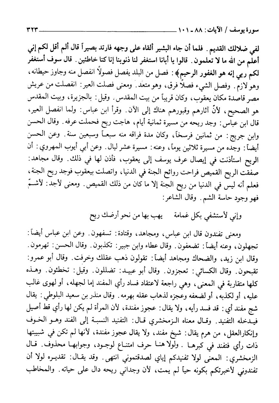 لَفِي ضَلالِكَ الْقَدِيمِ. فَلَمَّا أَنْ جاءَ الْبَشِيرُ أَلْقاهُ عَلى وَجْهِهِ فَارْتَدَّ بَصِيراً قالَ أَلَمْ أَقُلْ لَكُمْ إِنِّي أَعْلَمُ مِنَ اللَّهِ مَا لَا تَعْلَمُونَ. قالُوا يَا أَبانَا اسْتَغْفِرْ لَنا ذُنُوبَنا إِنَّا كُنَّا خاطِئِينَ. قالَ سَوْفَ أَسْتَغْفِرُ لَكُمْ رَبِّي إِنَّهُ هُوَ الْغَفُورُ الرَّحِيمُ: فَصَلَ مِنَ الْبَلَدِ يَفْصِلُ فُصُولًا انْفَصَلَ مِنْهُ وَجَاوَزَ حِيطَانَهُ، وَهُوَ لَازِمٌ. وَفَصَلَ الشَّيْءَ فَصْلًا فَرَّقَ، وَهُوَ مُتَعَدٍّ. وَمَعْنَى فَصَلَتِ الْعِيرُ: انْفَصَلَتْ مِنْ عَرِيشِ مِصْرَ قَاصِدَةً مَكَانَ يَعْقُوبَ، وَكَانَ قَرِيبًا مِنْ بَيْتِ الْمَقْدِسِ. وَقِيلَ: بِالْجَزِيرَةِ، وَبَيْتُ الْمَقْدِسِ هُوَ الصَّحِيحُ، لِأَنَّ آثَارَهُمْ وَقُبُورَهُمْ هُنَاكَ إِلَى الْآنِ. وَقَرَأَ ابْنُ عَبَّاسٍ: وَلَمَّا انْفَصَلَ الْعِيرُ، قَالَ ابْنُ عَبَّاسٍ: وَجَدَ رِيحَهُ مِنْ مَسِيرَةِ ثَمَانِيَةِ أَيَّامٍ، هَاجَتْ رِيحٌ فَحَمَلَتْ عُرْفَهُ. وَقَالَ الْحَسَنُ وَابْنُ جُرَيْجٍ: مِنْ ثَمَانِينَ فَرْسَخًا، وَكَانَ مُدَّةُ فِرَاقِهِ مِنْهُ سَبْعًا وَسَبْعِينَ سَنَةً. وَعَنِ الْحَسَنِ أَيْضًا: وَجَدَهُ مِنْ مَسِيرَةِ ثَلَاثِينَ يَوْمًا، وَعَنْهُ: مَسِيرَةُ عَشْرِ لَيَالٍ. وَعَنْ أَبِي أَيُّوبَ الْمَهْرَوِيِّ: أَنَّ الرِّيحَ اسْتَأْذَنَتْ فِي إِيصَالِ عُرْفِ يُوسُفَ إِلَى يَعْقُوبَ، فَأُذِنَ لَهَا فِي ذَلِكَ. وَقَالَ مُجَاهِدٌ: