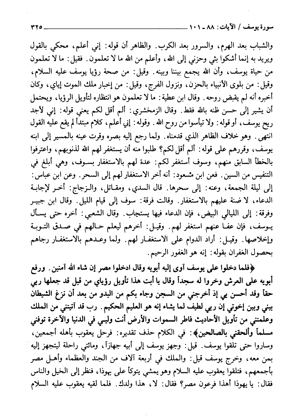 وَالشَّبَابُ بَعْدَ الْهَرَمِ، وَالسُّرُورُ بَعْدَ الْكَرْبِ. وَالظَّاهِرُ أَنَّ قَوْلَهُ: أَنِّي أَعْلَمُ، مَحْكِيٌّ بِالْقَوْلِ وَيُرِيدُ بِهِ إِنَّمَا أشكوا بَثِّي وَحُزْنِي إِلَى اللَّهِ، وَأَعْلَمُ مِنَ اللَّهِ مَا لَا تَعْلَمُونَ. فَقِيلَ: مَا لَا تَعْلَمُونَ مِنْ حَيَاةِ يُوسُفَ، وَأَنَّ اللَّهَ يَجْمَعُ بَيْنَنَا وَبَيْنَهُ. وَقِيلَ: مِنْ صِحَّةِ رُؤْيَا يُوسُفَ عَلَيْهِ السَّلَامُ، وَقِيلَ: مِنْ بَلْوَى الْأَنْبِيَاءِ بِالْحُزْنِ، وَنُزُولِ الْفَرَجِ، وَقِيلَ: مِنْ أَخْبَارِ مَلَكِ الْمَوْتِ إِيَّايَ، وَكَانَ أَخْبَرَهُ أَنَّهُ لَمْ يَقْبِضْ رُوحَهُ. وَقَالَ ابْنُ عَطِيَّةَ: مَا لَا تَعْلَمُونَ هُوَ انْتِظَارُهُ لِتَأْوِيلِ الرُّؤْيَا، وَيُحْتَمَلُ أَنْ يُشِيرَ إِلَى حُسْنِ ظَنِّهِ بِاللَّهِ فَقَطْ. وَقَالَ الزَّمَخْشَرِيُّ: أَلَمْ أَقُلْ لَكُمْ يَعْنِي قَوْلَهُ: إِنِّي لَأَجِدُ رِيحَ يُوسُفَ، أَوْ قَوْلَهُ: وَلَا تَيْأَسُوا مِنْ رَوْحِ اللَّهِ. وَقَوْلُهُ: إِنِّي أَعْلَمُ، كَلَامٌ مُبْتَدَأٌ لَمْ يَقَعْ عَلَيْهِ الْقَوْلُ انْتَهَى. وَهُوَ خِلَافُ الظَّاهِرِ الَّذِي قَدَّمْنَاهُ. وَلَمَّا رَجَعَ إِلَيْهِ بَصَرُهُ وَقَرَّتْ عَيْنُهُ بِالْمَسِيرِ إِلَى ابْنِهِ يُوسُفَ، وَقَرَّرَهُمْ عَلَى قَوْلِهِ: أَلَمْ أَقُلْ لَكُمْ؟ طَلَبُوا منه أن يستغفر لهم اللَّهَ لِذُنُوبِهِمْ، وَاعْتَرَفُوا بِالْخَطَأِ السابق منهم، وسوف أَسْتَغْفِرُ لَكُمْ: عِدَةٌ لَهُمْ بِالِاسْتِغْفَارِ بِسَوْفَ، وَهِيَ أَبْلَغُ فِي التَّنْفِيسِ مِنَ السِّينِ. فَعَنِ ابْنِ مَسْعُودٍ: إِنَّهُ أَخَّرَ الِاسْتِغْفَارَ لَهُمْ إِلَى السَّحَرِ. وَعَنِ ابْنِ عَبَّاسٍ: