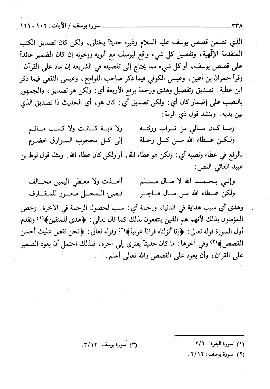 الَّذِي تَضَمَّنَ قَصَصَ يُوسُفَ عَلَيْهِ السَّلَامُ وَغَيْرِهِ حَدِيثًا يُخْتَلَقُ، وَلَكِنْ كَانَ تَصْدِيقَ الْكُتُبِ الْمُتَقَدِّمَةِ الْإِلَهِيَّةِ، وَتَفْصِيلَ كُلِّ شَيْءٍ وَاقِعٍ لِيُوسُفَ مَعَ أَبَوَيْهِ وَإِخْوَتِهِ إِنْ كَانَ الضَّمِيرُ عَائِدًا عَلَى قَصَصِ يُوسُفَ، أَوْ كُلِّ شَيْءٍ مِمَّا يَحْتَاجُ إِلَى تَفْصِيلِهِ فِي الشَّرِيعَةِ إِنْ عَادَ عَلَى الْقُرْآنِ.