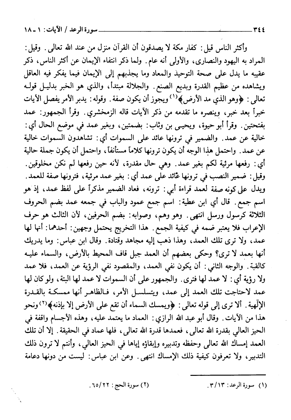 خَالِيَةً عَنْ عَمَدٍ. وَالضَّمِيرُ فِي تَرَوْنَهَا عائد على السموات أي: تشاهدون السموات خَالِيَةً عَنْ عَمَدٍ. وَاحْتَمَلَ هَذَا الْوَجْهِ أَنْ يَكُونَ تَرَوْنَهَا كَلَامًا مُسْتَأْنَفًا، وَاحْتَمَلَ أَنْ يَكُونَ جُمْلَةً حَالِيَّةً أَيْ: رَفَعَهَا مَرْئِيَّةً لَكُمْ بِغَيْرِ عَمَدٍ. وَهِيَ حَالٌ مُقَدَّرَةٌ، لِأَنَّهُ حِينَ رَفَعَهَا لَمْ نَكُنْ مَخْلُوقِينَ.