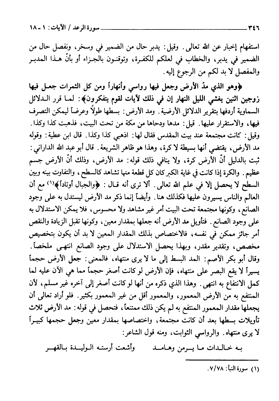 ثَبَتَ بِالدَّلِيلِ أَنَّ الْأَرْضَ كُرَةٌ، وَلَا يُنَافِي ذَلِكَ قَوْلَهُ: مَدَّ الْأَرْضَ، وَذَلِكَ أَنَّ الْأَرْضَ جِسْمٌ عَظِيمٌ. وَالْكُرَةُ إِذَا كَانَتْ فِي غَايَةِ الكبر كان كل قِطْعَةٌ مِنْهَا تُشَاهَدُ كَالسَّطْحِ، وَالتَّفَاوُتُ بَيْنَهُ وَبَيْنَ السَّطْحِ لَا يَحْصُلُ إِلَّا فِي عِلْمِ اللَّهِ تَعَالَى. أَلَا تَرَى أَنَّهُ قَالَ: وَالْجِبالَ أَوْتاداً «1» مَعَ أَنَّ الْعَالَمَ وَالنَّاسَ يَسِيرُونَ عَلَيْهَا فَكَذَلِكَ هُنَا. وَأَيْضًا إِنَّمَا ذَكَرَ مَدَّ الْأَرْضِ لِيَسْتَدِلَّ بِهِ عَلَى وُجُودِ الصَّانِعِ، وَكَوْنُهَا مُجْتَمِعَةً تَحْتَ الْبَيْتِ أَمْرٌ غَيْرُ مُشَاهَدٍ وَلَا مَحْسُوسٍ، فَلَا يُمْكِنُ الِاسْتِدْلَالُ بِهِ عَلَى وُجُودِ الصَّانِعِ. فَتَأْوِيلُ مَدَّ الْأَرْضَ أَنَّهُ جَعَلَهَا بِمِقْدَارٍ مُعَيَّنٍ، وَكَوْنُهَا تَقْبَلُ الزِّيَادَةَ وَالنَّقْصَ أَمْرٌ جَائِزٌ مُمْكِنٌ فِي نَفْسِهِ، فَالِاخْتِصَاصُ بِذَلِكَ الْمِقْدَارِ الْمُعَيَّنِ لَا بُدَّ أَنْ يَكُونَ بِتَخْصِيصِ مُخَصَّصٍ، وَتَقْدِيرِ مُقَدَّرٍ، وَبِهَذَا يَحْصُلُ الِاسْتِدْلَالُ عَلَى وُجُودِ الصَّانِعِ انْتَهَى مُلَخَّصًا.