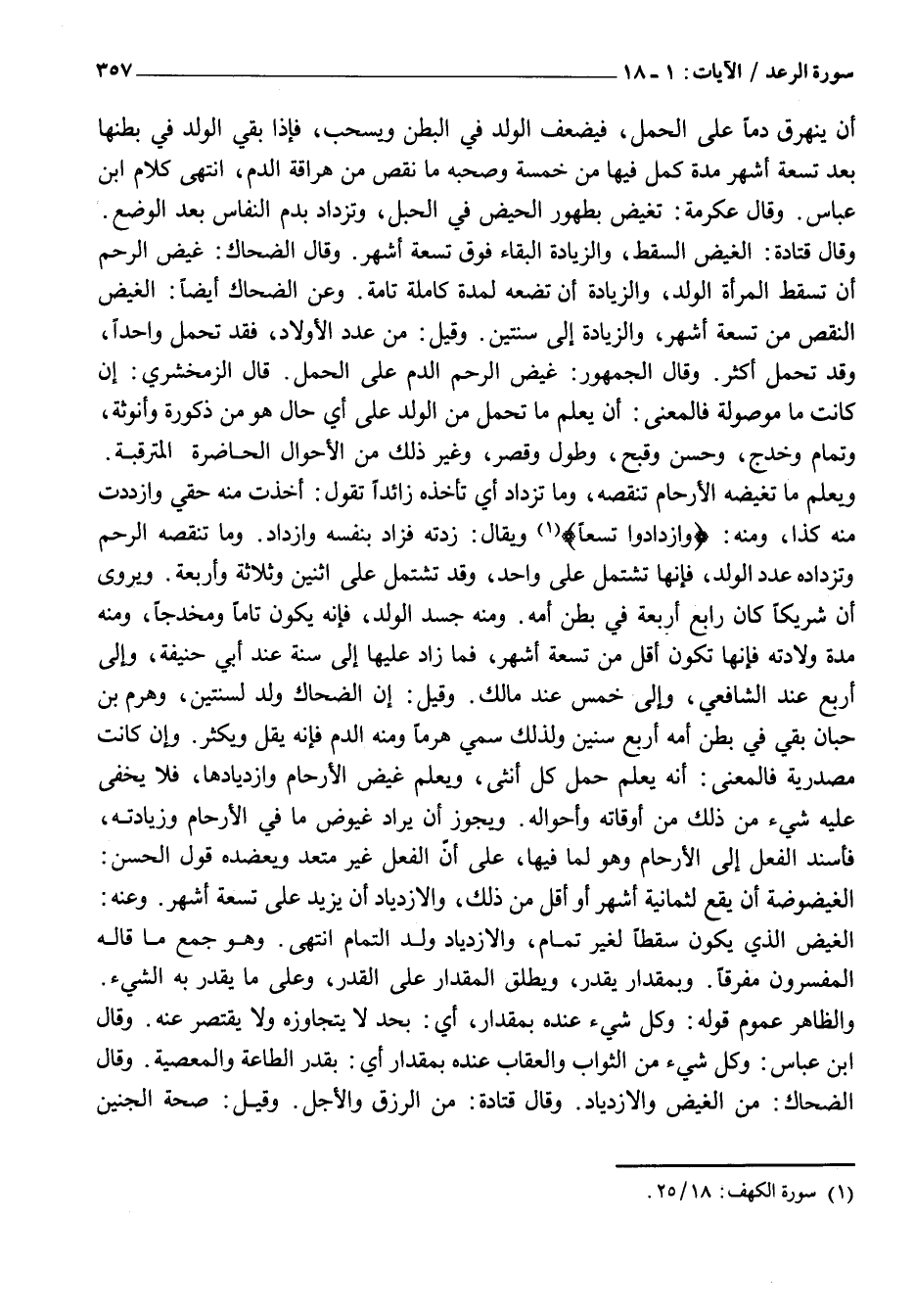 أَنْ يَنْهَرِقَ دَمًا عَلَى الْحَمْلِ، فَيَضْعُفُ الْوَلَدُ فِي الْبَطْنِ وَيُسْحَبُ، فَإِذَا بَقِيَ الْوَلَدُ فِي بَطْنِهَا بَعْدَ تِسْعَةِ أَشْهُرٍ مُدَّةً كَمُلَ فِيهَا مِنْ خَمْسَةٍ وَصَحِبَهُ مَا نَقَصَ مِنْ هِرَاقَةِ الدَّمِ، انْتَهَى كَلَامُ ابْنِ عَبَّاسٍ. وَقَالَ عِكْرِمَةُ: تَغِيضُ بِطَهُورِ الْحَيْضِ فِي الْحَبَلِ، وَتَزْدَادُ بِدَمِ النِّفَاسِ بَعْدَ الْوَضْعِ.
