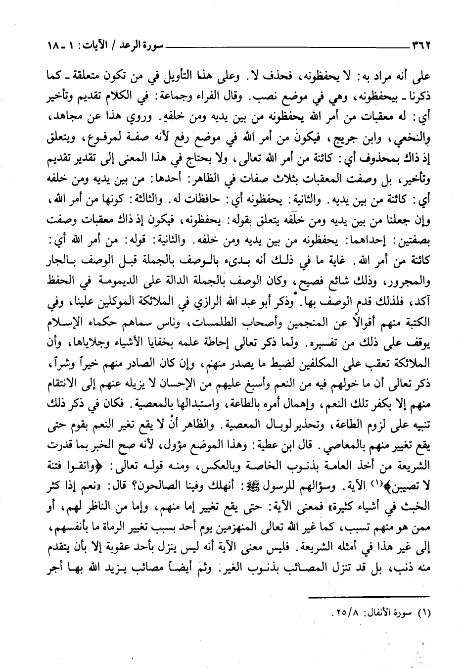كَائِنَةٌ مِنْ أَمْرِ اللَّهِ. غَايَةُ مَا فِي ذَلِكَ أنه بدىء بِالْوَصْفِ بِالْجُمْلَةِ قَبْلَ الْوَصْفِ بِالْجَارِّ وَالْمَجْرُورِ، وَذَلِكَ شَائِعٌ فَصِيحٌ، وَكَانَ الْوَصْفُ بِالْجُمْلَةِ الدَّالَّةِ عَلَى الدَّيْمُومَةِ فِي الْحِفْظِ آكَدَ، فَلِذَلِكَ قَدَّمَ الْوَصْفَ بِهَا. وَذَكَرَ أَبُو عَبْدِ اللَّهِ الرَّازِيُّ فِي الْمَلَائِكَةِ الْمُوَكَّلِينَ عَلَيْنَا، وَفِي الْكَتَبَةِ مِنْهُمْ أَقْوَالًا عَنِ المنجمين وأصحاب الطلسمات، وَنَاسٍ سَمَّاهُمْ حُكَمَاءُ الْإِسْلَامِ يُوقِفُ عَلَى ذَلِكَ مِنْ تَفْسِيرِهِ. وَلَمَّا ذَكَرَ تَعَالَى إِحَاطَةَ عِلْمِهِ بِخَفَايَا الْأَشْيَاءِ وَجَلَايَاهَا، وَأَنَّ الْمَلَائِكَةَ تُعَقِّبُ عَلَى الْمُكَلَّفِينَ لِضَبْطِ مَا يَصْدُرُ مِنْهُمْ، وَإِنْ كَانَ الصَّادِرُ مِنْهُمْ خَيْرًا وَشَرًّا، ذَكَرَ تَعَالَى أَنَّ مَا خَوَّلَهُمْ فِيهِ مِنَ النِّعَمِ وَأَسْبَغَ عَلَيْهِمْ مِنَ الْإِحْسَانِ لَا يُزِيلُهُ عَنْهُمْ إِلَى الِانْتِقَامِ مِنْهُمْ إِلَّا بِكُفْرِ تِلْكَ النِّعَمِ، وَإِهْمَالِ أَمْرِهِ بِالطَّاعَةِ، وَاسْتِبْدَالِهَا بِالْمَعْصِيَةِ. فَكَانَ فِي ذِكْرِ ذَلِكَ تَنْبِيهٌ عَلَى لُزُومِ الطَّاعَةِ، وَتَحْذِيرٌ لِوَبَالِ الْمَعْصِيَةِ. وَالظَّاهِرُ أَنْ لَا يَقَعَ تَغَيُّرُ النِّعَمِ بِقَوْمٍ حَتَّى يَقَعَ تَغْيِيرٌ مِنْهُمْ بِالْمَعَاصِي. قَالَ ابْنُ عَطِيَّةَ: وَهَذَا الموضع مؤول، لِأَنَّهُ صَحَّ الْخَبَرُ بِمَا قَدَّرَتِ الشَّرِيعَةُ مِنْ أَخْذِ الْعَامَّةِ بِذُنُوبِ الْخَاصَّةِ وَبِالْعَكْسِ، وَمِنْهُ قَوْلِهِ تَعَالَى: وَاتَّقُوا فِتْنَةً لَا تُصِيبَنَّ «1» الْآيَةَ.