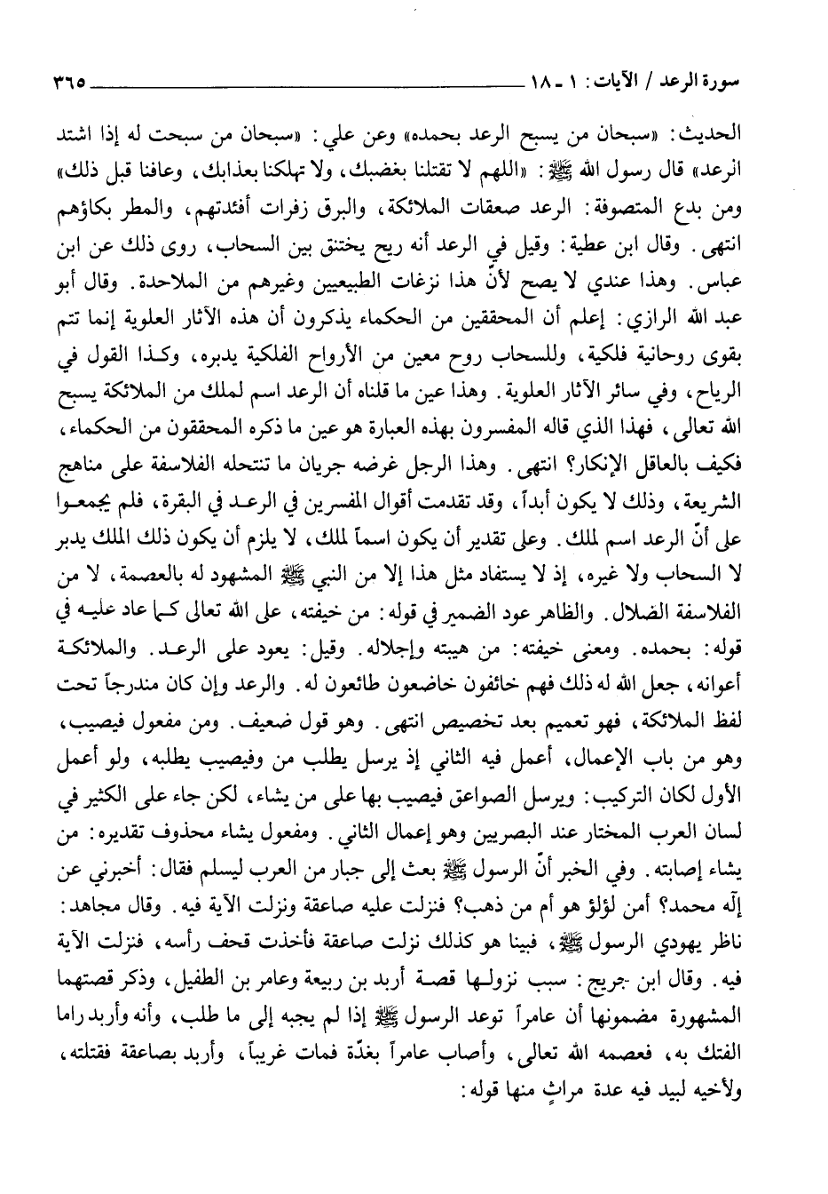 وَمِنْ بِدَعِ الْمُتَصَوِّفَةِ: الرَّعْدُ صَعَقَاتُ الْمَلَائِكَةِ، وَالْبَرْقُ زَفَرَاتُ أَفْئِدَتِهِمْ، وَالْمَطَرُ بُكَاؤُهُمْ انْتَهَى. وَقَالَ ابْنُ عَطِيَّةَ: وَقِيلَ فِي الرَّعْدِ أَنَّهُ رِيحٌ يَخْتَنِقُ بَيْنَ السَّحَابِ، رُوِيَ ذَلِكَ عَنِ ابْنِ عَبَّاسٍ. وَهَذَا عِنْدِي لَا يَصِحُّ لِأَنَّ هَذَا نَزَغَاتُ الطَّبِيعِيِّينَ وَغَيْرِهِمْ مِنَ الْمَلَاحِدَةِ. وَقَالَ أَبُو عَبْدِ اللَّهِ الرَّازِيُّ: اعْلَمْ أَنَّ الْمُحَقِّقِينَ مِنَ الْحُكَمَاءِ يَذْكُرُونَ أَنَّ هَذِهِ الْآثَارَ الْعُلْوِيَّةَ إِنَّمَا تَتِمُّ بِقُوًى رُوحَانِيَّةٍ فَلَكِيَّةٍ، وَلِلسَّحَابِ رُوحٌ مُعَيَّنٌ مِنَ الْأَرْوَاحِ الْفَلَكِيَّةِ يُدَبِّرُهُ، وَكَذَا الْقَوْلُ فِي الرِّيَاحِ، وَفِي سَائِرِ الْآثَارِ الْعُلْوِيَّةِ. وَهَذَا عَيْنُ مَا قُلْنَاهُ أَنَّ الرَّعْدَ اسْمٌ لِمَلَكٍ مِنَ الْمَلَائِكَةِ يُسَبِّحُ اللَّهُ تَعَالَى، فَهَذَا الَّذِي قَالَهُ الْمُفَسِّرُونَ بِهَذِهِ الْعِبَارَةِ هُوَ عَيْنُ مَا ذَكَرَهُ الْمُحَقِّقُونَ مِنَ الْحُكَمَاءِ، فَكَيْفَ بِالْعَاقِلِ الْإِنْكَارُ؟ انْتَهَى. وَهَذَا الرَّجُلُ غَرَضُهُ جَرَيَانُ مَا تَنْتَحِلُهُ الْفَلَاسِفَةُ عَلَى مَنَاهِجِ الشَّرِيعَةِ، وَذَلِكَ لَا يكون أبدا، وقد تقدمت أَقْوَالُ الْمُفَسِّرِينَ فِي الرَّعْدِ فِي الْبَقَرَةِ، فَلَمْ يُجْمِعُوا عَلَى أَنَّ الرَّعْدَ اسْمٌ لِمَلَكٍ. وَعَلَى تَقْدِيرِ أَنْ يَكُونَ اسْمًا لِمَلَكٍ، لَا يَلْزَمُ أَنْ يَكُونَ ذَلِكَ الملك يدبر لا السحاب وَلَا غَيْرِهِ، إِذْ لَا يُسْتَفَادُ مِثْلُ هَذَا إِلَّا مِنَ النَّبِيِّ صَلَّى اللَّهُ عَلَيْهِ وَسَلَّمَ الْمَشْهُودُ لَهُ بِالْعِصْمَةِ، لَا مِنَ الْفَلَاسِفَةِ الضُّلَّالِ. وَالظَّاهِرُ عَوْدُ الضَّمِيرِ فِي قَوْلِهِ: مِنْ خِيفَتِهِ، عَلَى اللَّهِ تَعَالَى كَمَا عَادَ عَلَيْهِ فِي قَوْلِهِ: بِحَمْدِهِ. وَمَعْنَى خِيفَتِهِ: مِنْ هَيْبَتِهِ وَإِجْلَالِهِ. وَقِيلَ: يَعُودُ عَلَى الرَّعْدِ. وَالْمَلَائِكَةُ أَعْوَانُهُ، جَعَلَ اللَّهُ لَهُ ذَلِكَ فَهُمْ خَائِفُونَ خَاضِعُونَ طَائِعُونَ لَهُ. وَالرَّعْدُ وَإِنْ كَانَ مُنْدَرِجًا تَحْتَ لَفْظِ الْمَلَائِكَةِ، فَهُوَ تَعْمِيمٌ بَعْدَ تَخْصِيصٍ انْتَهَى. وَهُوَ قَوْلٌ ضَعِيفٌ. ومن مَفْعُولُ فَيُصِيبُ، وَهُوَ مِنْ بَابِ الْإِعْمَالِ، أَعْمَلَ فِيهِ الثَّانِيَ إِذْ يُرْسِلُ يَطْلُبُ من وفيصيب يَطْلُبُهُ، وَلَوْ أُعْمِلَ الْأَوَّلُ لَكَانَ التَّرْكِيبُ: وَيُرْسِلُ الصَّوَاعِقَ فَيُصِيبُ بِهَا عَلَى مَنْ يَشَاءُ، لَكِنْ جَاءَ عَلَى الْكَثِيرُ فِي لِسَانِ الْعَرَبِ الْمُخْتَارُ عِنْدَ الْبَصْرِيِّينَ وَهُوَ إِعْمَالُ الثَّانِي. وَمَفْعُولُ يَشَاءُ مَحْذُوفٌ تَقْدِيرُهُ: مَنْ يَشَاءُ إِصَابَتَهُ.