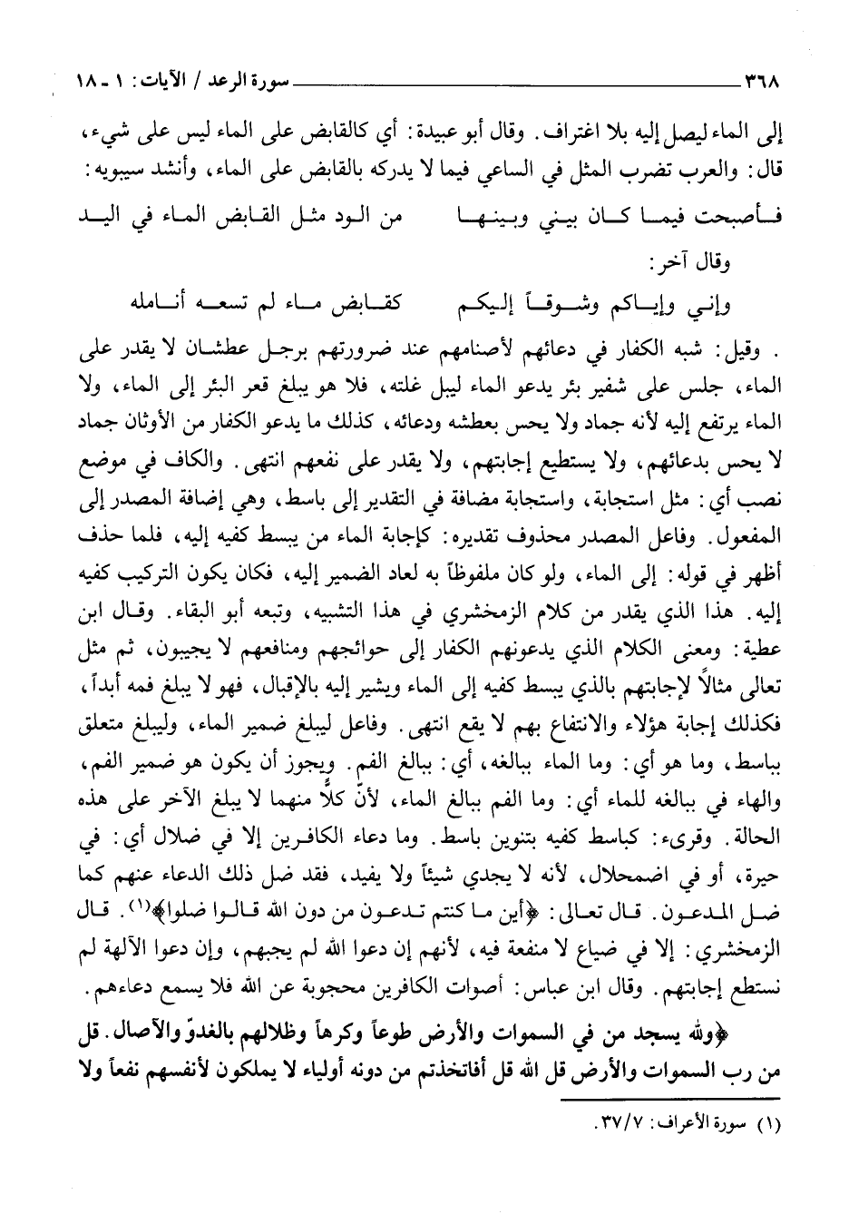 وَقِيلَ: شَبَّهُ الْكُفَّارَ فِي دُعَائِهِمْ لِأَصْنَامِهِمْ عِنْدَ ضَرُورَتِهِمْ بِرَجُلٍ عَطْشَانَ لَا يَقْدِرُ عَلَى الْمَاءِ، جَلَسَ عَلَى شَفِيرِ بِئْرٍ يَدْعُو الْمَاءَ لِيَبُلَّ غَلَّتَهُ، فَلَا هُوَ يَبْلُغُ قَعْرَ الْبِئْرِ إِلَى الْمَاءِ، وَلَا الْمَاءُ يَرْتَفِعُ إِلَيْهِ لِأَنَّهُ جَمَادٌ وَلَا يَحِسُّ بِعَطَشِهِ وَدُعَائِهِ، كَذَلِكَ مَا يَدْعُو الْكُفَّارُ مِنَ الْأَوْثَانِ جَمَادٌ لَا يَحِسُّ بِدُعَائِهِمْ، وَلَا يَسْتَطِيعُ إِجَابَتَهُمْ، وَلَا يَقْدِرُ عَلَى نَفْعِهِمْ انْتَهَى. وَالْكَافُ فِي مَوْضِعِ نَصْبٍ أَيْ: مثل اسْتِجَابَةٍ، وَاسْتِجَابَةٌ مُضَافَةٌ فِي التَّقْدِيرِ إِلَى بَاسِطٍ، وَهِيَ إِضَافَةِ الْمَصْدَرِ إِلَى الْمَفْعُولِ. وَفَاعِلُ الْمَصْدَرِ مَحْذُوفٌ تَقْدِيرُهُ: كَإِجَابَةِ الْمَاءِ مَنْ يَبْسُطُ كَفَّيْهِ إِلَيْهِ، فَلَمَّا حُذِفَ أُظْهِرَ فِي قَوْلِهِ: إِلَى الْمَاءِ، وَلَوْ كَانَ مَلْفُوظًا بِهِ لَعَادَ الضَّمِيرُ إِلَيْهِ، فَكَانَ يَكُونُ التَّرْكِيبُ كَفَّيْهِ إِلَيْهِ. هَذَا الَّذِي يُقَدَّرُ مِنْ كَلَامِ الزَّمَخْشَرِيِّ فِي هَذَا التَّشْبِيهِ، وَتَبِعَهُ أَبُو الْبَقَاءِ. وَقَالَ ابْنُ عَطِيَّةَ: وَمَعْنَى الْكَلَامِ الَّذِي يَدْعُونَهُمُ الْكُفَّارُ إِلَى حَوَائِجِهِمْ وَمَنَافِعِهِمْ لَا يُجِيبُونَ، ثُمَّ مَثَّلَ تَعَالَى مِثَالًا لِإِجَابَتِهِمْ بِالَّذِي يَبْسُطُ كَفَّيْهِ إِلَى الْمَاءِ وَيُشِيرُ إِلَيْهِ بِالْإِقْبَالِ، فَهُوَ لَا يَبْلُغُ فَمَهُ أَبَدًا، فَكَذَلِكَ إِجَابَةُ هَؤُلَاءِ وَالِانْتِفَاعُ بِهِمْ لَا يَقَعُ انْتَهَى. وَفَاعِلُ لِيَبْلُغَ ضَمِيرُ الْمَاءِ، وليبلغ متعلق بباسط، وَمَا هُوَ أَيْ: وَمَا الْمَاءُ بِبَالِغِهِ، أَيْ: بِبَالِغِ الْفَمِ. وَيَجُوزُ أَنْ يَكُونَ هُوَ ضَمِيرُ الْفَمِ، وَالْهَاءُ فِي بِبَالِغِهِ لِلْمَاءِ أَيْ: وَمَا الْفَمُ بِبَالِغِ الْمَاءِ، لِأَنَّ كُلًّا مِنْهُمَا لَا يَبْلُغُ الْآخَرَ عَلَى هَذِهِ الحالة. وقرىء: كَبَاسِطٍ كَفَّيْهِ بِتَنْوِينِ بَاسِطٍ. وَمَا دُعَاءُ الْكَافِرِينَ إِلَّا فِي ضَلَالٍ أَيْ: فِي حَيْرَةٍ، أَوْ فِي اضْمِحْلَالٍ، لِأَنَّهُ لَا يُجْدِي شَيْئًا وَلَا يُفِيدُ، فَقَدْ ضَلَّ ذَلِكَ الدُّعَاءُ عَنْهُمْ كَمَا ضَلَّ الْمَدْعُونَ. قَالَ تَعَالَى: أَيْنَ مَا كُنْتُمْ تَدْعُونَ مِنْ دُونِ اللَّهِ قالُوا ضَلُّوا «1» . قَالَ الزَّمَخْشَرِيُّ: إِلَّا فِي ضَيَاعٍ لَا مَنْفَعَةَ فِيهِ، لِأَنَّهُمْ إِنْ دَعَوُا اللَّهَ لَمْ يُجِبْهُمْ، وَإِنْ دعوا الآلهة لم نستطع إِجَابَتَهُمْ. وَقَالَ ابْنُ عَبَّاسٍ: أَصْوَاتُ الْكَافِرِينَ مَحْجُوبَةٌ عَنِ الله فلا يسمع دعاءهم.