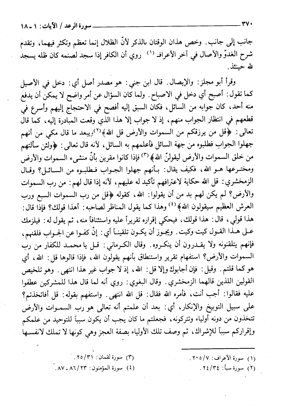 وَقَرَأَ أَبُو مِجْلَزٍ: وَالْإِيصَالُ. قَالَ ابْنُ جِنِّيٍّ: هُوَ مَصْدَرُ أَصْلٍ أَيْ: دَخَلَ فِي الْأَصِيلِ كَمَا تَقُولُ: أَصْبَحَ أَيْ دَخَلَ فِي الْإِصْبَاحِ. وَلَمَّا كَانَ السُّؤَالُ عَنِ أَمْرٍ وَاضِحٍ لَا يُمْكِنُ أَنْ يَدْفَعَ مِنْهُ أَحَدٌ، كَانَ جَوَابُهُ مِنَ السَّائِلِ، فَكَانَ السَّبْقُ إِلَيْهِ أَفْصَحُ فِي الِاحْتِجَاجِ إِلَيْهِمْ وَأَسْرَعُ فِي قَطْعِهِمْ فِي انْتِظَارِ الْجَوَابِ مِنْهُمْ، إِذْ لَا جَوَابَ إِلَّا هَذَا الَّذِي وَقَعَتِ الْمُبَادَرَةُ إِلَيْهِ، كَمَا قَالَ تَعَالَى: قُلْ مَنْ يَرْزُقُكُمْ مِنَ السَّماواتِ وَالْأَرْضِ قُلِ اللَّهُ «2» وَيَبْعُدُ مَا قَالَ مَكِّيٌّ مِنْ أَنَّهُمْ جهلوا الجواب فطلبوه من جِهَةِ السَّائِلِ فَأَعْلَمَهُمْ بِهِ السَّائِلُ، لِأَنَّهُ قَالَ تَعَالَى: وَلَئِنْ سَأَلْتَهُمْ مَنْ خَلَقَ السَّماواتِ وَالْأَرْضَ لَيَقُولُنَّ اللَّهُ «3» فَإِذَا كَانُوا مُقِرِّينَ بِأَنَّ منشىء السموات وَالْأَرْضِ وَمُخْتَرِعَهَا هُوَ اللَّهُ، فَكَيْفَ يُقَالُ: بِأَنَّهُمْ جَهِلُوا الْجَوَابَ فَطَلَبُوهُ مِنَ السَّائِلِ؟ وَقَالَ الزَّمَخْشَرِيُّ: قُلِ اللَّهُ حكاية لاعترافهم تأكيد لَهُ عَلَيْهِمْ، لِأَنَّهُ إِذَا قَالَ لَهُمْ: مَنْ رَبُّ السموات وَالْأَرْضِ؟ لَمْ يَكُنْ لَهُمْ بُدٌّ مِنْ أَنْ يَقُولُوا: اللَّهُ، كَقَوْلِهِ قُلْ مَنْ رَبِّ السَّمَاوَاتِ السَّبْعِ وَرَبِّ الْعَرْشِ الْعَظِيمِ سيقولون الله «4» وَهَذَا كَمَا يَقُولُ الْمُنَاظِرُ لِصَاحِبِهِ: أَهَذَا قَوْلُكَ؟ فَإِذَا قَالَ: