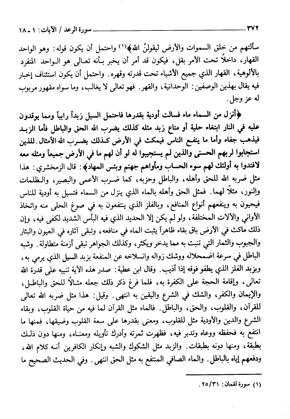 أَنْزَلَ مِنَ السَّماءِ مَاءً فَسالَتْ أَوْدِيَةٌ بِقَدَرِها فَاحْتَمَلَ السَّيْلُ زَبَداً رابِياً وَمِمَّا يُوقِدُونَ عَلَيْهِ فِي النَّارِ ابْتِغاءَ حِلْيَةٍ أَوْ مَتاعٍ زَبَدٌ مِثْلُهُ كَذلِكَ يَضْرِبُ اللَّهُ الْحَقَّ وَالْباطِلَ فَأَمَّا الزَّبَدُ فَيَذْهَبُ جُفاءً وَأَمَّا مَا يَنْفَعُ النَّاسَ فَيَمْكُثُ فِي الْأَرْضِ كَذلِكَ يَضْرِبُ اللَّهُ الْأَمْثالَ. لِلَّذِينَ اسْتَجابُوا لِرَبِّهِمُ الْحُسْنى وَالَّذِينَ لَمْ يَسْتَجِيبُوا لَهُ لَوْ أَنَّ لَهُمْ مَا فِي الْأَرْضِ جَمِيعاً وَمِثْلَهُ مَعَهُ لَافْتَدَوْا بِهِ أُولئِكَ لَهُمْ سُوءُ الْحِسابِ وَمَأْواهُمْ جَهَنَّمُ وَبِئْسَ الْمِهادُ: قَالَ الزَّمَخْشَرِيُّ: هَذَا مَثَلٌ ضَرْبَهُ اللَّهُ لِلْحَقِّ وَأَهْلِهِ، وَالْبَاطِلِ وَحِزْبِهِ، كَمَا ضَرَبَ الْأَعْمَى وَالْبَصِيرَ، وَالظُّلُمَاتِ وَالنُّورَ، مَثَلًا لَهُمَا. فَمَثَّلَ الْحَقَّ وَأَهْلَهُ بِالْمَاءِ الَّذِي يَنْزِلُ مِنَ السَّمَاءِ فَتَسِيلُ بِهِ أَوْدِيَةٌ لِلنَّاسِ فَيَحْيَوْنَ بِهِ وَيَنْفَعُهُمْ أَنْوَاعَ الْمَنَافِعِ، وَبِالْفِلِزِّ الَّذِي يَنْتَفِعُونَ بِهِ فِي صَوْغِ الْحُلِيِّ مِنْهُ وَاتِّخَاذِ الْأَوَانِي وَالْآلَاتِ الْمُخْتَلِفَةِ، وَلَوْ لَمْ يَكُنْ إِلَّا الْحَدِيدَ الَّذِي فِيهِ الْبَأْسُ الشَّدِيدُ لَكَفَى فِيهِ، وَإِنَّ ذَلِكَ مَاكِثٌ فِي الْأَرْضِ بَاقٍ بَقَاءً ظَاهِرًا يَثْبُتُ الْمَاءُ فِي مَنَافِعِهِ، وَتَبْقَى آثَارُهُ فِي العيون والبئار والجبوب وَالثِّمَارِ الَّتِي تَنْبُتُ بِهِ مِمَّا يُدَّخَرُ وَيَكْثُرُ، وَكَذَلِكَ الْجَوَاهِرُ تَبْقَى أَزْمِنَةً مُتَطَاوِلَةً. وَشَبَّهَ الْبَاطِلَ فِي سُرْعَةِ اضْمِحْلَالِهِ وَوَشْكِ زَوَالِهِ وَانْسِلَاخِهِ عَنِ الْمَنْفَعَةِ بِزَبَدِ السَّيْلِ الَّذِي يُرْمَى بِهِ، وَبِزَبَدِ الْفِلِزِّ الَّذِي يَطْفُو فَوْقَهُ إِذَا أُذِيبَ. وَقَالَ ابْنُ عَطِيَّةَ: صَدْرُ هَذِهِ الْآيَةِ تَنْبِيهٌ عَلَى قُدْرَةِ اللَّهِ تَعَالَى، وَإِقَامَةُ الْحُجَّةِ عَلَى الْكَفَرَةِ بِهِ، فَلَمَّا فَرَغَ ذِكْرُ ذَلِكَ جَعَلَهُ مِثَالًا لِلْحَقِّ وَالْبَاطِلِ، وَالْإِيمَانِ وَالْكُفْرِ، وَالشَّكِّ فِي الشَّرْعِ وَالْيَقِينِ بِهِ انْتَهَى. وَقِيلَ: هَذَا مَثَلٌ ضَرْبَهُ اللَّهُ تَعَالَى لِلْقُرْآنِ، وَالْقُلُوبِ، وَالْحَقِّ، وَالْبَاطِلِ. فَالْمَاءُ مِثْلُ الْقُرْآنِ لِمَا فِيهِ مِنْ حَيَاةِ الْقُلُوبِ، وَبَقَاءِ الشَّرْعِ وَالدِّينِ وَالْأَوْدِيَةُ مَثَلٌ لِلْقُلُوبِ، وَمَعْنَى بِقَدَرِهَا عَلَى سِعَةِ الْقُلُوبِ وَضِيقِهَا، فمنها ما انتفع بِهِ فَحَفِظَهُ وَوَعَاهُ وَتَدَبَّرَ فِيهِ، فَظَهَرَتْ ثَمَرَتُهُ وَأَدْرَكَ تَأْوِيلَهُ وَمَعْنَاهُ، وَمِنْهَا دُونَ ذَلِكَ بِطَبَقَةٍ، وَمِنْهَا دُونَهُ بِطَبَقَاتٍ. وَالزَّبَدُ مِثْلُ الشُّكُوكِ وَالشُّبَهِ وَإِنْكَارِ الْكَافِرِينَ أَنَّهُ كَلَامُ اللَّهِ، وَدَفْعِهِمْ إِيَّاهُ بِالْبَاطِلِ. وَالْمَاءُ الصَّافِي الْمُنْتَفِعُ بِهِ مِثْلُ الْحَقِّ انْتَهَى. وَفِي الْحَدِيثِ الصَّحِيحِ مَا