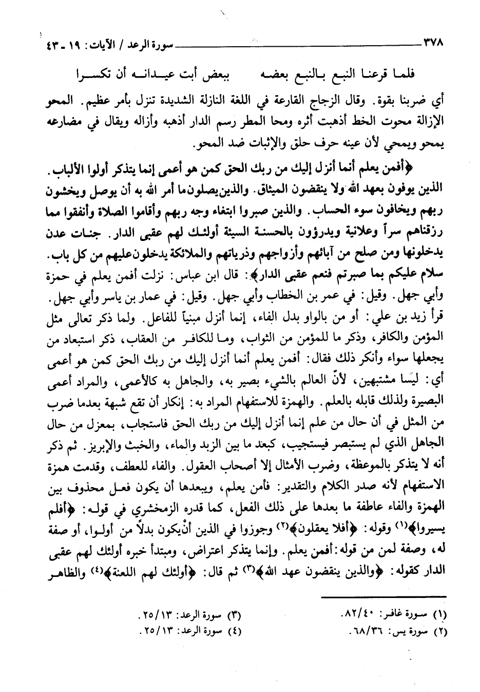 أَفَمَنْ يَعْلَمُ أَنَّما أُنْزِلَ إِلَيْكَ مِنْ رَبِّكَ الْحَقُّ كَمَنْ هُوَ أَعْمى إِنَّما يَتَذَكَّرُ أُولُوا الْأَلْبابِ. الَّذِينَ يُوفُونَ بِعَهْدِ اللَّهِ وَلا يَنْقُضُونَ الْمِيثاقَ. وَالَّذِينَ يَصِلُونَ مَا أَمَرَ اللَّهُ بِهِ أَنْ يُوصَلَ وَيَخْشَوْنَ رَبَّهُمْ وَيَخافُونَ سُوءَ الْحِسابِ. وَالَّذِينَ صَبَرُوا ابْتِغاءَ وَجْهِ رَبِّهِمْ وَأَقامُوا الصَّلاةَ وَأَنْفَقُوا مِمَّا رَزَقْناهُمْ سِرًّا وَعَلانِيَةً وَيَدْرَؤُنَ بِالْحَسَنَةِ السَّيِّئَةَ أُولئِكَ لَهُمْ عُقْبَى الدَّارِ. جَنَّاتُ عَدْنٍ يَدْخُلُونَها وَمَنْ صَلَحَ مِنْ آبائِهِمْ وَأَزْواجِهِمْ وَذُرِّيَّاتِهِمْ وَالْمَلائِكَةُ يَدْخُلُونَ عَلَيْهِمْ مِنْ كُلِّ بابٍ. سَلامٌ عَلَيْكُمْ بِما صَبَرْتُمْ فَنِعْمَ عُقْبَى الدَّارِ: قَالَ ابْنُ عَبَّاسٍ: نَزَلَتْ أَفَمَنْ يَعْلَمُ فِي حَمْزَةَ وَأَبِي جَهْلٍ. وَقِيلَ: فِي عُمَرَ بْنِ الْخَطَّابِ وَأَبِي جَهْلٍ. وَقِيلَ: فِي عَمَّارِ بْنِ يَاسِرٍ وَأَبِي جَهْلٍ.