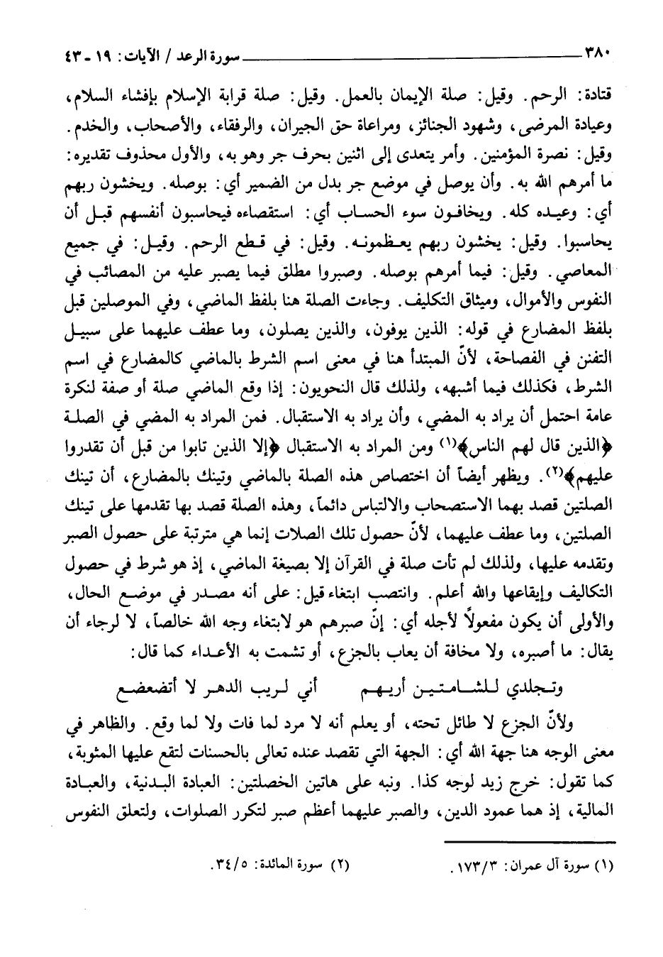 مَا أَمَرَهُمُ اللَّهُ بِهِ. وَأَنْ يُوصَلَ فِي مَوْضِعِ جَرٍّ بَدَلٌ مِنَ الضَّمِيرِ أَيْ: بوصله. ويخشون رَبَّهُمْ أَيْ: وَعِيدَهُ كُلَّهُ. ويخافون سوء الحساب أي: استقصاءه فَيُحَاسِبُونَ أَنْفُسَهُمْ قَبْلَ أَنْ يُحَاسَبُوا. وَقِيلَ: يَخْشَوْنَ رَبَّهُمْ يُعَظِّمُونَهُ. وَقِيلَ: فِي قَطْعِ الرَّحِمِ. وَقِيلَ: فِي جَمِيعِ الْمَعَاصِي. وَقِيلَ: فِيمَا أَمَرَهُمْ بوصله. وصبروا مُطْلَقٌ فِيمَا يُصْبَرُ عَلَيْهِ مِنَ الْمَصَائِبِ فِي النُّفُوسِ وَالْأَمْوَالِ، وَمِيثَاقِ التَّكْلِيفِ. وَجَاءَتِ الصِّلَةُ هُنَا بِلَفْظِ الْمَاضِي، وَفِي الْمُوصِلِينَ قَبْلُ بِلَفْظِ الْمُضَارِعِ فِي قَوْلِهِ: الَّذِينَ يوفون، والذين يصلون، وما عُطِفَ عَلَيْهِمَا عَلَى سَبِيلِ التَّفَنُّنِ فِي الْفَصَاحَةِ، لِأَنَّ الْمُبْتَدَأَ هُنَا فِي مَعْنَى اسْمِ الشَّرْطِ بِالْمَاضِي كَالْمُضَارِعِ فِي اسْمِ الشَّرْطِ، فَكَذَلِكَ فِيمَا أَشْبَهَهُ، وَلِذَلِكَ قَالَ النَّحْوِيُّونَ: إِذَا وَقَعَ الْمَاضِي صِلَةً أَوْ صِفَةً لِنَكِرَةٍ عَامَّةٍ احْتَمَلَ أَنْ يُرَادَ بِهِ الْمُضِيُّ، وَأَنْ يُرَادَ بِهِ الِاسْتِقْبَالُ. فَمِنَ الْمُرَادِ بِهِ الْمُضِيُّ فِي الصِّلَةِ الَّذِينَ قالَ لَهُمُ النَّاسُ «1» وَمِنَ الْمُرَادِ بِهِ الِاسْتِقْبَالُ إِلَّا الَّذِينَ تابُوا مِنْ قَبْلِ أَنْ تَقْدِرُوا عَلَيْهِمْ «2» . وَيَظْهَرُ أَيْضًا أَنَّ اخْتِصَاصَ هَذِهِ الصِّلَةِ بِالْمَاضِي وَتَيْنِكَ بِالْمُضَارِعِ، أَنَّ تَيْنِكَ الصِّلَتَيْنِ قُصِدَ بِهِمَا الِاسْتِصْحَابُ وَالِالْتِبَاسُ دَائِمًا، وَهَذِهِ الصِّلَةُ قُصِدَ بِهَا تَقَدُّمُهَا عَلَى تَيْنِكَ الصلتين، وما عُطِفَ عَلَيْهِمَا، لِأَنَّ حُصُولَ تِلْكَ الصِّلَاتِ إِنَّمَا هِيَ مُتَرَتِّبَةٌ عَلَى حُصُولِ الصَّبْرِ وَتَقَدُّمِهِ عَلَيْهَا، وَلِذَلِكَ لَمْ تَأْتِ صِلَةٌ فِي الْقُرْآنِ إِلَّا بِصِيغَةِ الْمَاضِي، إِذْ هُوَ شَرْطٌ فِي حُصُولِ التَّكَالِيفِ وَإِيقَاعِهَا وَاللَّهُ أَعْلَمُ. وَانْتَصَبَ ابْتِغَاءَ قِيلَ: عَلَى أَنَّهُ مَصْدَرٌ فِي مَوْضِعِ الْحَالِ، وَالْأَوْلَى أَنْ يَكُونَ مَفْعُولًا لِأَجْلِهِ أَيْ: إِنَّ صَبْرَهُمْ هُوَ لِابْتِغَاءِ وَجْهِ اللَّهِ خَالِصًا، لَا لِرَجَاءِ أَنْ يُقَالَ: مَا أَصْبَرَهُ، وَلَا مَخَافَةَ أَنْ يُعَابَ بِالْجَزَعِ، أَوْ تَشْمَتْ بِهِ الْأَعْدَاءُ كَمَا قَالَ: