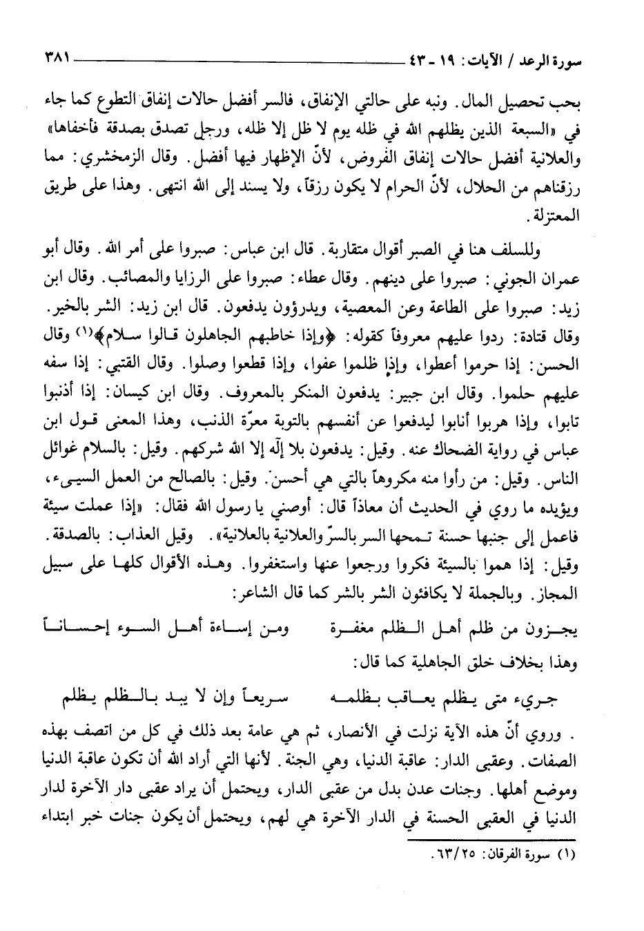 وَلِلسَّلَفِ هُنَا فِي الصَّبْرِ أَقْوَالٌ مُتَقَارِبَةٌ. قَالَ ابْنُ عَبَّاسٍ: صَبَرُوا عَلَى أَمْرَ اللَّهِ. وَقَالَ أَبُو عِمْرَانَ الْجَوْنِيُّ: صَبَرُوا عَلَى دِينِهِمْ. وَقَالَ عَطَاءٌ: صَبَرُوا عَلَى الرَّزَايَا وَالْمَصَائِبِ. وَقَالَ ابْنُ زَيْدٍ: صَبَرُوا عَلَى الطَّاعَةِ وَعَنِ المعصية، ويدرؤون يَدْفَعُونَ. قَالَ ابْنُ زَيْدٍ: الشَّرُّ بِالْخَيْرِ.