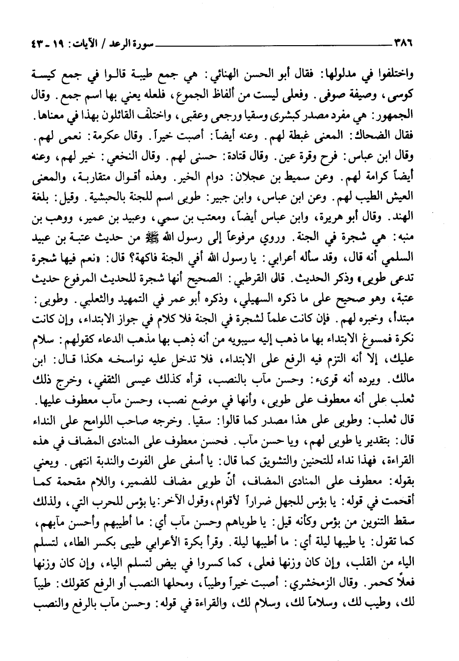 وَذَكَرَ الْحَدِيثَ. قَالَ الْقُرْطُبِيُّ: الصَّحِيحُ أَنَّهَا شَجَرَةٌ لِلْحَدِيثِ الْمَرْفُوعِ حَدِيثِ عُتْبَةَ، وَهُوَ صَحِيحٌ عَلَى مَا ذَكَرَهُ السُّهَيْلِيُّ، وَذَكَرَهُ أَبُو عُمَرَ في التمهيد والثعلبي. وطوبى:
