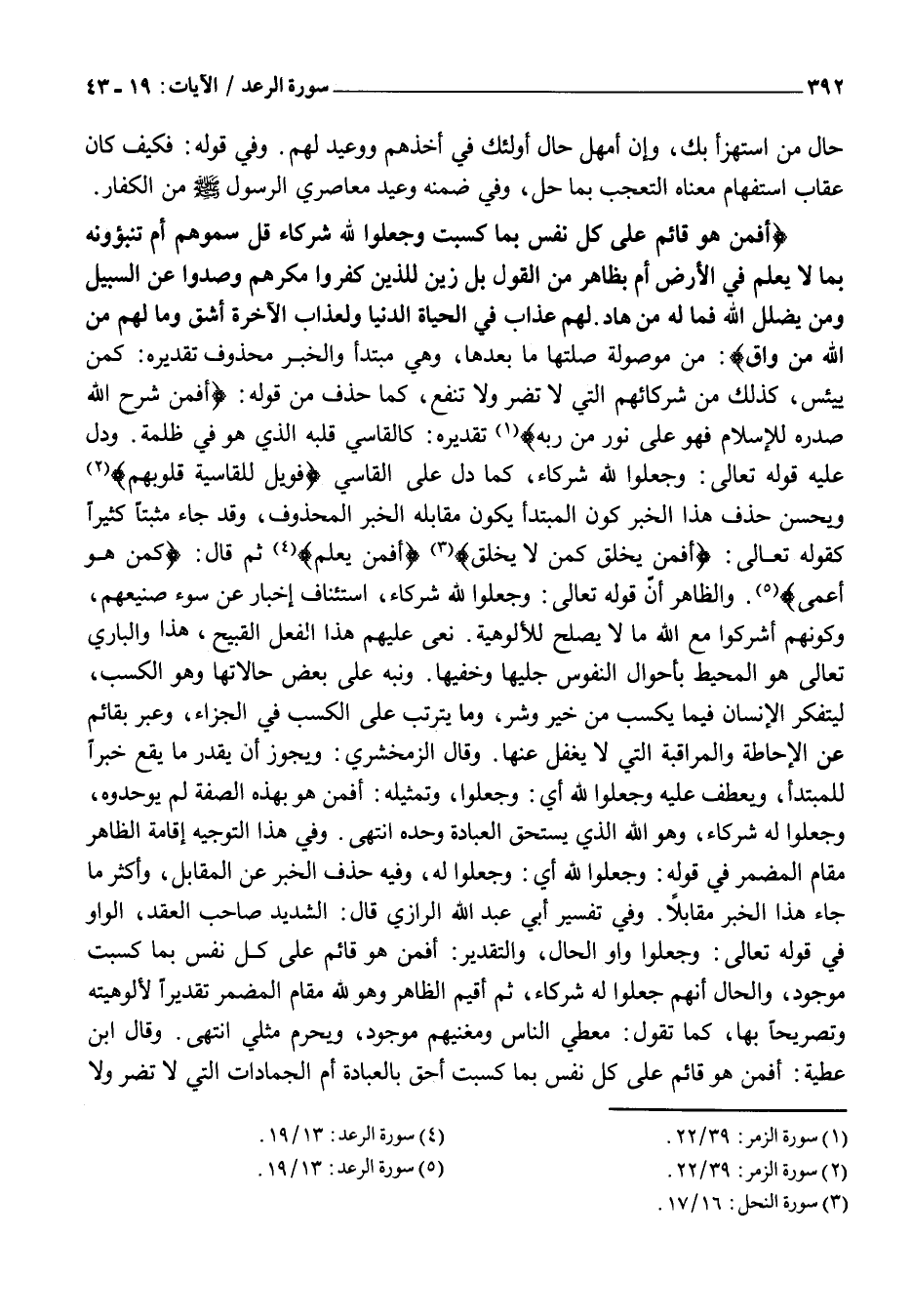 أَفَمَنْ هُوَ قائِمٌ عَلى كُلِّ نَفْسٍ بِما كَسَبَتْ وَجَعَلُوا لِلَّهِ شُرَكاءَ قُلْ سَمُّوهُمْ أَمْ تُنَبِّئُونَهُ بِما لَا يَعْلَمُ فِي الْأَرْضِ أَمْ بِظاهِرٍ مِنَ الْقَوْلِ بَلْ زُيِّنَ لِلَّذِينَ كَفَرُوا مَكْرُهُمْ وَصُدُّوا عَنِ السَّبِيلِ وَمَنْ يُضْلِلِ اللَّهُ فَما لَهُ مِنْ هادٍ. لَهُمْ عَذابٌ فِي الْحَياةِ الدُّنْيا وَلَعَذابُ الْآخِرَةِ أَشَقُّ وَما لَهُمْ مِنَ اللَّهِ مِنْ واقٍ: مَنْ مَوْصُولَةٌ صِلَتُهَا مَا بَعْدَهَا، وَهِيَ مُبْتَدَأٌ وَالْخَبَرُ مَحْذُوفٌ تَقْدِيرُهُ: كَمَنْ يَيَئْسُ، كَذَلِكَ مِنْ شُرَكَائِهِمُ الَّتِي لَا تَضُرُّ وَلَا تَنْفَعُ، كَمَا حُذِفَ مِنْ قَوْلِهِ: أَفَمَنْ شَرَحَ اللَّهُ صَدْرَهُ لِلْإِسْلامِ فَهُوَ عَلى نُورٍ مِنْ رَبِّهِ «1» تَقْدِيرُهُ: كَالْقَاسِي قَلْبُهُ الَّذِي هُوَ فِي ظُلْمَةٍ. وَدَلَّ عَلَيْهِ قَوْلُهُ تَعَالَى: وَجَعَلُوا لِلَّهِ شُرَكَاءَ، كَمَا دَلَّ عَلَى الْقَاسِي فَوَيْلٌ لِلْقاسِيَةِ قُلُوبُهُمْ «2» وَيُحَسِّنُ حَذْفَ هَذَا الْخَبَرِ كَوْنُ الْمُبْتَدَأِ يَكُونُ مُقَابِلُهُ الْخَبَرَ الْمَحْذُوفَ، وَقَدْ جَاءَ مُثْبَتًا كَثِيرًا كَقَوْلِهِ تَعَالَى: أَفَمَنْ يَخْلُقُ كَمَنْ لَا يَخْلُقُ «3» أَفَمَنْ يَعْلَمُ «4» ثُمَّ قَالَ: كَمَنْ هُوَ أَعْمى «5» . وَالظَّاهِرُ أَنَّ قَوْلَهُ تَعَالَى: وَجَعَلُوا لِلَّهِ شُرَكَاءَ، اسْتِئْنَافُ إِخْبَارٍ عَنْ سُوءِ صَنِيعِهِمْ، وَكَوْنِهِمْ أَشْرَكُوا مَعَ اللَّهِ مَا لَا يَصْلُحُ لِلْأُلُوهِيَّةِ. نَعَى عَلَيْهِمْ هَذَا الْفِعْلَ الْقَبِيحَ، هَذَا وَالْبَارِي تَعَالَى هُوَ الْمُحِيطُ بِأَحْوَالِ النُّفُوسِ جَلَيِّهَا وَخَفِيِّهَا. وَنَبَّهَ عَلَى بَعْضِ حَالَاتِهَا وَهُوَ الْكَسْبُ، لِيَتَفَكَّرَ الْإِنْسَانُ فِيمَا يَكْسِبُ مِنْ خَيْرٍ وَشَرٍّ، وَمَا يَتَرَتَّبُ عَلَى الْكَسْبِ فِي الْجَزَاءِ، وَعَبَّرَ بِقَائِمٍ عَنِ الْإِحَاطَةِ وَالْمُرَاقَبَةِ الَّتِي لَا يَغْفُلُ عَنْهَا. وَقَالَ الزَّمَخْشَرِيُّ: وَيَجُوزُ أَنْ يُقَدَّرَ مَا يَقَعُ خَبَرًا لِلْمُبْتَدَأِ، وَيُعْطَفُ عَلَيْهِ وَجَعَلُوا لِلَّهِ أَيْ: وَجَعَلُوا، وَتَمْثِيلُهُ: أَفَمَنْ هُوَ بِهَذِهِ الصِّفَةِ لَمْ يُوَحِّدُوهُ، وَجَعَلُوا لَهُ شُرَكَاءَ، وَهُوَ اللَّهُ الَّذِي يَسْتَحِقُّ الْعِبَادَةَ وَحْدَهُ انْتَهَى. وَفِي هَذَا التَّوْجِيهِ إِقَامَةُ الظَّاهِرِ مَقَامَ الْمُضْمَرِ فِي قَوْلِهِ: وَجَعَلُوا لِلَّهِ أَيْ: وَجَعَلُوا لَهُ، وَفِيهِ حَذْفُ الْخَبَرِ عَنِ الْمُقَابِلِ، وَأَكْثَرُ مَا جَاءَ هَذَا الْخَبَرُ مُقَابِلًا. وَفِي تَفْسِيرِ أَبِي عَبْدِ اللَّهِ الرَّازِيِّ قَالَ: الشَّدِيدُ صَاحِبُ الْعَقْدِ، الْوَاوُ فِي قَوْلِهِ تَعَالَى: وَجَعَلُوا وَاوُ الْحَالِ، وَالتَّقْدِيرُ: أَفَمَنْ هُوَ قَائِمٌ عَلَى كُلِّ نَفْسٍ بِمَا كَسَبَتْ مَوْجُودٌ، وَالْحَالُ أَنَّهُمْ جَعَلُوا لَهُ شُرَكَاءَ، ثُمَّ أُقِيمَ الظَّاهِرُ وَهُوَ لِلَّهِ مَقَامَ الْمُضْمَرِ تَقْدِيرًا لِأُلُوهِيَّتِهِ وَتَصْرِيحًا بِهَا، كَمَا تَقُولُ: مُعْطِي النَّاسِ وَمُغْنِيهِمْ مَوْجُودٌ، وَيُحْرَمُ مِثْلِي انْتَهَى. وَقَالَ ابْنُ عَطِيَّةَ: أَفَمَنْ هُوَ قَائِمٌ عَلَى كُلِّ نَفْسٍ بِمَا كَسَبَتْ أَحَقُّ بِالْعِبَادَةِ أَمِ الْجَمَادَاتُ الَّتِي لا تضر ولا