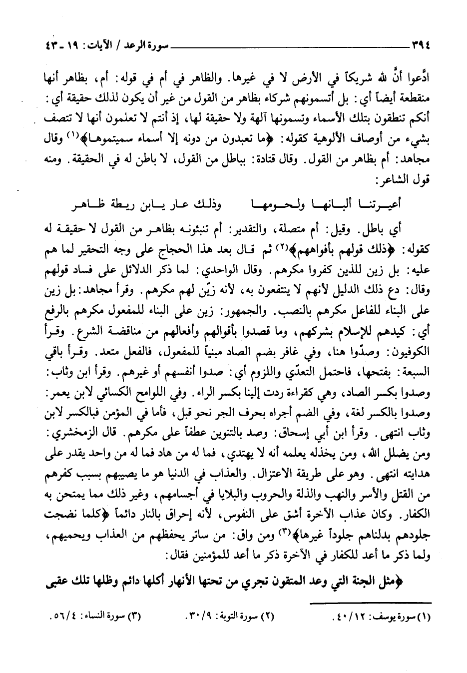 ادَّعَوْا أَنَّ لِلَّهِ شَرِيكًا فِي الْأَرْضِ لَا فِي غَيْرِهَا. وَالظَّاهِرُ فِي أَمْ فِي قَوْلِهِ: أَمْ، بِظَاهِرٍ أَنَّهَا مُنْقَطِعَةٌ أَيْضًا أَيْ: بَلْ أَتُسَمُّونَهُمْ شُرَكَاءَ بِظَاهِرٍ مِنَ الْقَوْلِ مِنْ غَيْرِ أَنْ يَكُونَ لِذَلِكَ حَقِيقَةٌ أَيْ: