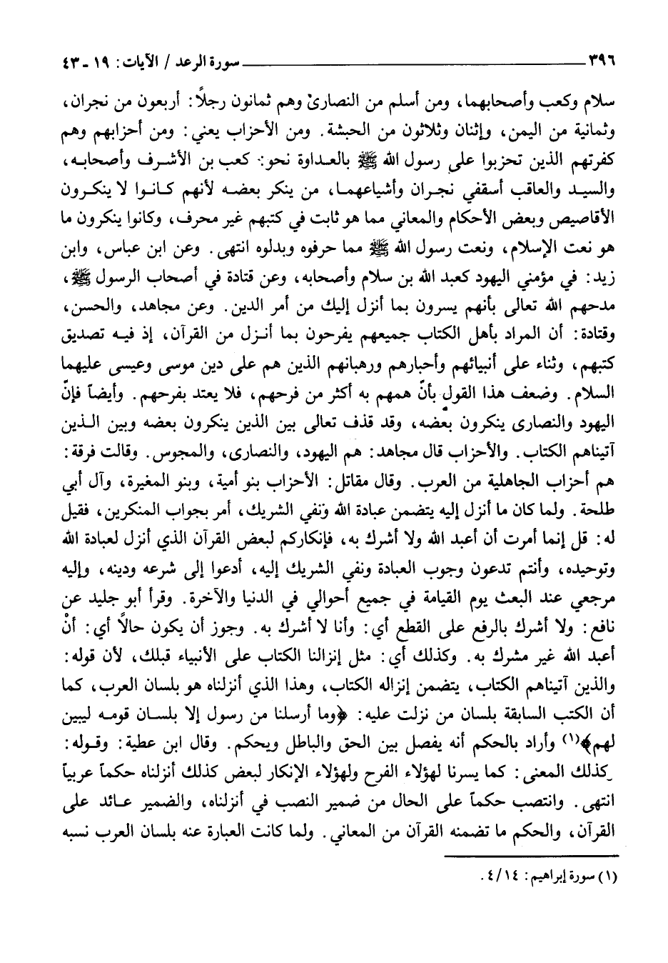 سَلَامٍ وَكَعْبٍ وَأَصْحَابِهِمَا، وَمَنْ أَسْلَمَ مِنَ النَّصَارَى وَهُمْ ثَمَانُونَ رَجُلًا: أَرْبَعُونَ مِنْ نَجْرَانَ، وَثَمَانِيَةٌ مِنَ الْيَمَنِ، وَاثْنَانِ وَثَلَاثُونَ مِنَ الْحَبَشَةِ. وَمِنَ الْأَحْزَابِ يَعْنِي: وَمِنْ أَحْزَابِهِمْ وَهُمْ كَفَرَتُهُمُ الَّذِينَ تَحَزَّبُوا عَلَى رَسُولِ اللَّهِ صَلَّى اللَّهُ عَلَيْهِ وَسَلَّمَ بِالْعَدَاوَةِ نَحْوُ: كَعْبُ بْنُ الْأَشْرَفِ وَأَصْحَابُهُ، وَالسَّيِّدِ وَالْعَاقِبِ أسقفي نجران وأشياعهما، ومن يُنْكِرُ بَعْضَهُ لِأَنَّهُمْ كَانُوا لَا يُنْكِرُونَ الْأَقَاصِيصَ وَبَعْضَ الْأَحْكَامِ وَالْمَعَانِي مِمَّا هُوَ ثَابِتٌ فِي كُتُبِهِمْ غَيْرُ مُحَرَّفٍ، وَكَانُوا يُنْكِرُونَ مَا هُوَ نَعْتُ الْإِسْلَامِ، وَنَعْتُ رسول الله صلى الله عَلَيْهِ وَسَلَّمَ مِمَّا حَرَّفُوهُ وَبَدَّلُوهُ انْتَهَى. وَعَنِ ابْنُ عَبَّاسٍ، وَابْنُ زَيْدٍ: فِي مُؤْمِنِي الْيَهُودِ كَعَبْدِ اللَّهِ بْنِ سَلَامٍ وَأَصْحَابِهِ، وَعَنْ قَتَادَةَ فِي أَصْحَابِ الرَّسُولِ صَلَّى اللَّهُ عَلَيْهِ وَسَلَّمَ، مَدَحَهُمُ اللَّهُ تَعَالَى بِأَنَّهُمْ يُسِرُّونَ بِمَا أُنْزِلَ إِلَيْكَ مِنْ أَمْرِ الدِّينِ. وَعَنْ مُجَاهِدٍ، وَالْحَسَنِ، وَقَتَادَةَ: أَنَّ الْمُرَادَ بِأَهْلِ الْكِتَابِ جَمِيعُهُمْ يَفْرَحُونَ بِمَا أُنْزِلَ مِنَ الْقُرْآنِ، إِذْ فِيهِ تَصْدِيقُ كُتُبِهِمْ، وَثَنَاءٌ عَلَى أَنْبِيَائِهِمْ وَأَحْبَارِهِمْ وَرُهْبَانِهِمُ الَّذِينَ هُمْ عَلَى دِينِ مُوسَى وَعِيسَى عَلَيْهِمَا السَّلَامُ. وَضَعُفَ هَذَا الْقَوْلِ بِأَنَّ هَمَّهُمْ بِهِ أَكْثَرُ مِنْ فَرَحِهِمْ، فَلَا يُعْتَدُّ بِفَرَحِهِمْ. وَأَيْضًا فَإِنَّ الْيَهُودَ وَالنَّصَارَى يُنْكِرُونَ بَعْضَهُ، وَقَدْ قَذَفَ تَعَالَى بَيْنَ الَّذِينَ يُنْكِرُونَ بَعْضَهُ وَبَيْنَ الذين آتيناهم الكتاب. والأحزاب قَالَ مُجَاهِدٌ: هُمُ الْيَهُودُ، وَالنَّصَارَى، وَالْمَجُوسُ. وَقَالَتْ فِرْقَةٌ: