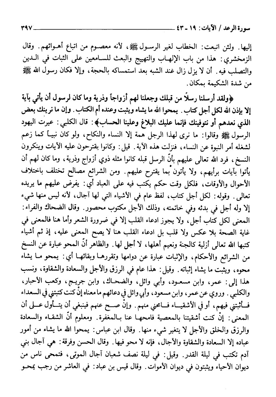 وَلَقَدْ أَرْسَلْنا رُسُلًا مِنْ قَبْلِكَ وَجَعَلْنا لَهُمْ أَزْواجاً وَذُرِّيَّةً وَما كانَ لِرَسُولٍ أَنْ يَأْتِيَ بِآيَةٍ إِلَّا بِإِذْنِ اللَّهِ لِكُلِّ أَجَلٍ كِتابٌ. يَمْحُوا اللَّهُ مَا يَشاءُ وَيُثْبِتُ وَعِنْدَهُ أُمُّ الْكِتابِ. وَإِنْ مَا نُرِيَنَّكَ بَعْضَ الَّذِي نَعِدُهُمْ أَوْ نَتَوَفَّيَنَّكَ فَإِنَّما عَلَيْكَ الْبَلاغُ وَعَلَيْنَا الْحِسابُ:
