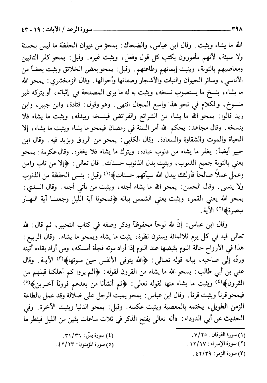 لِقَوْلِهِ: أَلَمْ يَرَوْا كَمْ أَهْلَكْنا قَبْلَهُمْ مِنَ الْقُرُونِ «4» وَيُثْبِتُ مَا يَشَاءُ مِنْهَا لِقَوْلِهِ تَعَالَى: ثُمَّ أَنْشَأْنا مِنْ بَعْدِهِمْ قُرُوناً آخَرِينَ «5» فَيَمْحُو قَرْنًا وَيُثْبِتُ قَرْنًا. وَقَالَ ابْنُ عَبَّاسٍ: يَمْحُو يُمِيتُ الرَّجُلَ عَلَى ضَلَالَةٍ وَقَدْ عَمِلَ بِالطَّاعَةِ الزَّمَنَ الطَّوِيلَ، يَخْتِمُهُ بِالْمَعْصِيَةِ وَيُثْبِتُ عَكْسَهُ. وَقِيلَ: يَمْحُو الدُّنْيَا وَيُثْبِتُ الْآخِرَةَ.