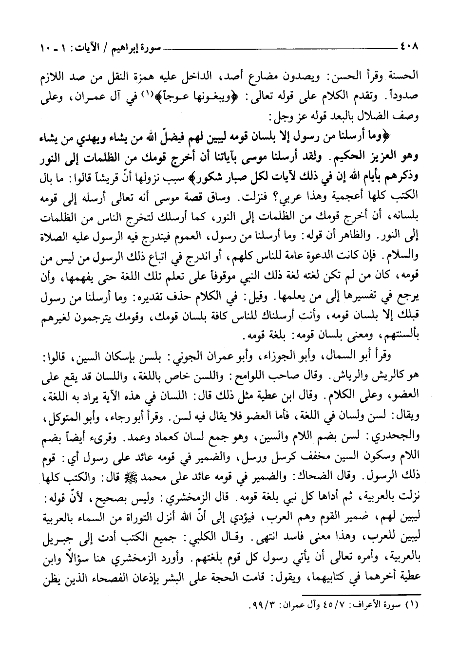هُوَ كَالرِّيشِ وَالرِّيَاشِ. وَقَالَ صَاحِبُ الْلَوَامِحِ: وَاللِّسْنُ خَاصٌّ بِاللُّغَةِ، وَاللِّسَانُ قَدْ يَقَعُ عَلَى الْعُضْوِ، وَعَلَى الْكَلَامِ. وَقَالَ ابْنُ عَطِيَّةَ مِثْلَ ذَلِكَ قَالَ: اللِّسَانُ فِي هَذِهِ الْآيَةِ يُرَادُ بِهِ اللُّغَةُ، وَيُقَالُ: لِسْنٌ وَلِسَانٌ فِي اللُّغَةِ، فَأَمَّا الْعُضْوُ فَلَا يُقَالُ فِيهِ لِسْنٌ. وَقَرَأَ أَبُو رَجَاءٍ، وَأَبُو الْمُتَوَكِّلِ، وَالْجَحْدَرِيُّ: لُسُنِ بِضَمِّ اللَّامِ وَالسِّينِ، وَهُوَ جَمْعُ لسان كعماد وعمد. وقرىء أَيْضًا بِضَمِّ اللَّامِ وَسُكُونِ السِّينِ مُخَفَّفٌ كَرُسُلٍ وَرُسْلٍ، وَالضَّمِيرُ فِي قَوْمِهِ عَائِدٌ عَلَى رَسُولٍ أَيْ: قَوْمِ ذَلِكَ الرَّسُولِ. وَقَالَ الضَّحَّاكُ: وَالضَّمِيرُ فِي قَوْمِهِ عَائِدٌ عَلَى مُحَمَّدٍ صَلَّى اللَّهُ عَلَيْهِ وَسَلَّمَ قَالَ: وَالْكُتُبُ كُلُّهَا نَزَلَتْ بِالْعَرَبِيَّةِ، ثُمَّ أَدَّاهَا كُلُّ نَبِيٍّ بِلُغَةِ قَوْمِهِ. قَالَ الزَّمَخْشَرِيُّ: وَلَيْسَ بِصَحِيحٍ، لِأَنَّ قَوْلَهُ: