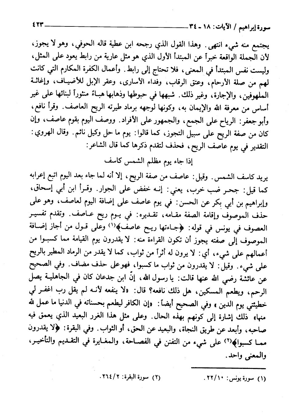 يَجْتَمِعَ مِنْهُ شَيْءٌ انْتَهَى. وَهَذَا الْقَوْلُ الَّذِي رَجَّحَهُ ابن عطية قال الْحَوْفِيُّ، وَهُوَ لَا يَجُوزُ، لِأَنَّ الْجُمْلَةَ الْوَاقِعَةَ خَبَرًا عَنِ الْمُبْتَدَأِ الْأَوَّلِ الَّذِي هُوَ مَثَلُ عَارِيَةٌ مِنْ رَابِطٍ يَعُودُ عَلَى الْمَثَلِ، وَلَيْسَتْ نَفْسَ الْمُبْتَدَأِ فِي الْمَعْنَى، فَلَا تَحْتَاجُ إِلَى رَابِطٍ. وَأَعْمَالُ الْكَفَرَةِ الْمَكَارِمُ الَّتِي كَانَتْ لَهُمْ مِنْ صِلَةِ الْأَرْحَامِ، وَعِتْقِ الرِّقَابِ، وَفِدَاءِ الْأَسَارَى، وَعَقْرِ الْإِبِل لِلْأَضْيَافِ، وَإِغَاثَةِ الْمَلْهُوفِينَ، وَالْإِجَارَةِ، وَغَيْرِ ذَلِكَ. شَبَّهَهَا فِي حبوطها وذهابها هباء مَنْثُورًا لِبِنَائِهَا عَلَى غَيْرِ أَسَاسٍ مِنْ مَعْرِفَةِ اللَّهِ وَالْإِيمَانِ بِهِ، وَكَوْنِهَا لِوَجْهِهِ بِرَمَادٍ طَيَّرَتْهُ الرِّيحُ الْعَاصِفُ. وَقَرَأَ نَافِعٌ، وَأَبُو جَعْفَرٍ: الرِّيَاحُ عَلَى الْجَمْعِ، وَالْجُمْهُورُ عَلَى الْإِفْرَادِ. وَوَصْفُ الْيَوْمِ بقوم عَاصِفٍ، وَإِنْ كَانَ مِنْ صِفَةِ الرِّيحِ عَلَى سَبِيلِ التَّجَوُّزِ، كَمَا قَالُوا: يَوْمَ مَا حَلَّ وَكِيلٌ نَائِمٌ. وَقَالَ الْهَرَوِيُّ:
