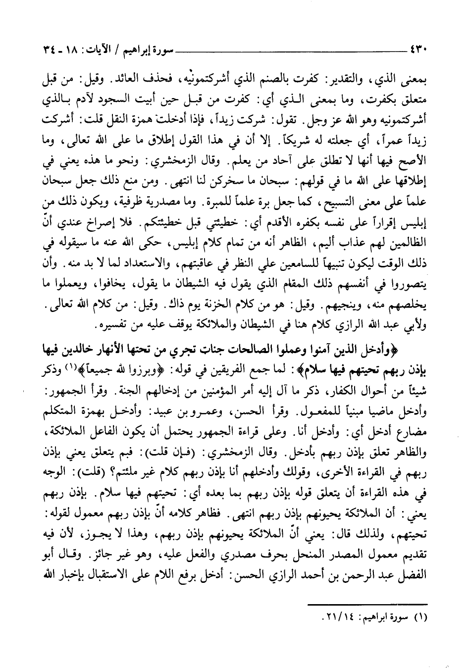 تَحِيَّتُهُمْ، وَلِذَلِكَ قَالَ: يَعْنِي أَنَّ الْمَلَائِكَةَ يُحَيُّونَهُمْ بِإِذْنِ رَبِّهِمْ، وَهَذَا لَا يَجُوزُ، لِأَنَّ فِيهِ تَقْدِيمَ مَعْمُولِ الْمَصْدَرِ الْمُنْحَلِّ بِحَرْفٍ مَصْدَرِيٍّ وَالْفِعْلُ عَلَيْهِ، وَهُوَ غَيْرُ جَائِزٍ. وَقَالَ أَبُو الْفَضْلِ عَبْدُ الرَّحْمَنِ بْنُ أَحْمَدَ الرَّازِيُّ الْحَسَنُ: أُدْخِلُ بِرَفْعِ اللَّامِ عَلَى الِاسْتِقْبَالِ بِإِخْبَارِ الله