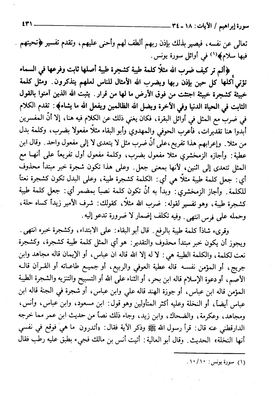 أَلَمْ تَرَ كَيْفَ ضَرَبَ اللَّهُ مَثَلًا كَلِمَةً طَيِّبَةً كَشَجَرَةٍ طَيِّبَةٍ أَصْلُها ثابِتٌ وَفَرْعُها فِي السَّماءِ تُؤْتِي أُكُلَها كُلَّ حِينٍ بِإِذْنِ رَبِّها وَيَضْرِبُ اللَّهُ الْأَمْثالَ لِلنَّاسِ لَعَلَّهُمْ يَتَذَكَّرُونَ. وَمَثَلُ كَلِمَةٍ خَبِيثَةٍ كَشَجَرَةٍ خَبِيثَةٍ اجْتُثَّتْ مِنْ فَوْقِ الْأَرْضِ مَا لَها مِنْ قَرارٍ. يُثَبِّتُ اللَّهُ الَّذِينَ آمَنُوا بِالْقَوْلِ الثَّابِتِ فِي الْحَياةِ الدُّنْيا وَفِي الْآخِرَةِ وَيُضِلُّ اللَّهُ الظَّالِمِينَ وَيَفْعَلُ اللَّهُ مَا يَشاءُ: تَقَدَّمَ الْكَلَامُ فِي ضَرَبَ مَعَ الْمَثَلِ فِي أَوَائِلِ الْبَقَرَةِ، فَكَانَ يُغْنِي ذَلِكَ عَنِ الْكَلَامِ فِيهِ هُنَا، إِلَّا أَنَّ الْمُفَسِّرِينَ أَبْدَوْا هُنَا تَقْدِيرَاتٍ، فَأَعْرَبَ الْحَوْفِيُّ وَالْمَهْدَوِيُّ وَأَبُو البقاء مثلا مفعولا بضرب، وكلمة بَدَلٌ مِنْ مَثَلًا. وَإِعْرَابُهُمْ هَذَا تَفْرِيعٌ، عَلَى أَنَّ ضرب مثل لَا يَتَعَدَّى لَا إِلَى مَفْعُولٍ وَاحِدٌ. وَقَالَ ابْنُ عَطِيَّةَ: وَأَجَازَهُ الزَّمَخْشَرِيُّ مَثَلًا مفعول بضرب، وكلمة مَفْعُولٌ أَوَّلُ تَفْرِيعًا عَلَى أَنَّهَا مَعَ الْمَثَلِ تَتَعَدَّى إِلَى اثْنَيْنِ، لِأَنَّهَا بِمَعْنَى جَعَلَ. وَعَلَى هَذَا تَكُونُ شجرة خبر مبتدأ محذوف أي: جَعَلَ كَلِمَةَ طَيِّبَةٍ مَثَلًا هِيَ أَيِ: الْكَلِمَةُ كَشَجَرَةٍ طَيِّبَةٍ، وَعَلَى الْبَدَلِ تَكُونُ كَشَجَرَةٍ نَعْتًا لِلْكَلِمَةِ. وَأَجَازَ الزَّمَخْشَرِيُّ: وَبَدَأَ بِهِ أَنْ تَكُونَ كَلِمَةً نَصْبًا بِمُضْمَرٍ أي: جعل كلمة طيبة كَشَجَرَةٍ طَيِّبَةٍ، وَهُوَ تَفْسِيرٌ لِقَوْلِهِ: ضَرَبَ اللَّهُ مَثَلًا، كَقَوْلِكَ: شَرَّفَ الْأَمِيرُ زَيْدًا كَسَاهُ حُلَّةً، وَحَمَلَهُ عَلَى فَرَسٍ انْتَهَى. وَفِيهِ تَكَلُّفُ إِضْمَارٍ لَا ضَرُورَةَ تَدْعُو إِلَيْهِ.