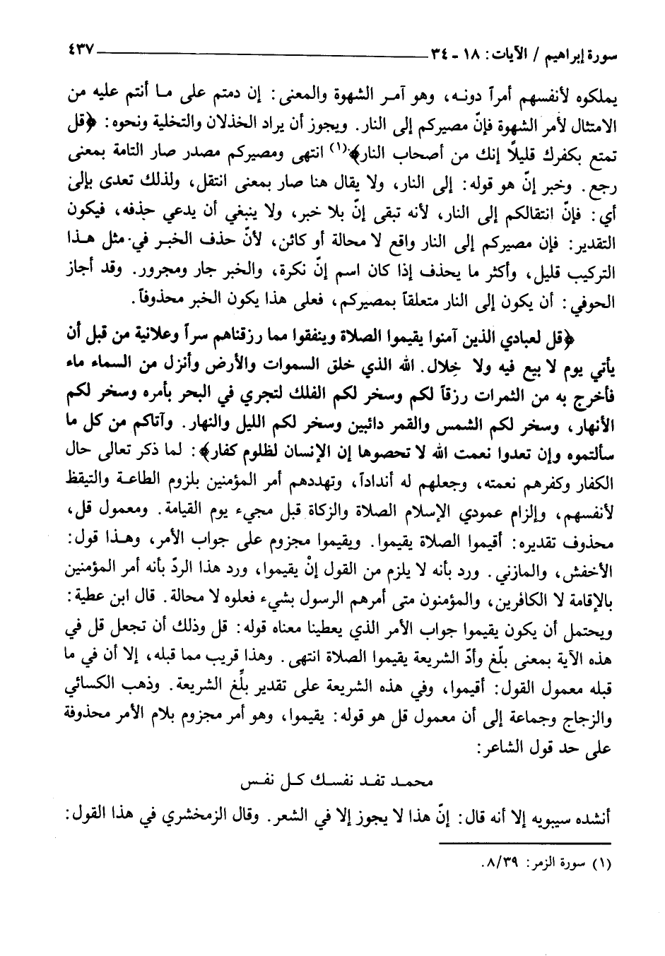 قُلْ لِعِبادِيَ الَّذِينَ آمَنُوا يُقِيمُوا الصَّلاةَ وَيُنْفِقُوا مِمَّا رَزَقْناهُمْ سِرًّا وَعَلانِيَةً مِنْ قَبْلِ أَنْ يَأْتِيَ يَوْمٌ لَا بَيْعٌ فِيهِ وَلا خِلالٌ. اللَّهُ الَّذِي خَلَقَ السَّماواتِ وَالْأَرْضَ وَأَنْزَلَ مِنَ السَّماءِ مَاءً فَأَخْرَجَ بِهِ مِنَ الثَّمَراتِ رِزْقاً لَكُمْ وَسَخَّرَ لَكُمُ الْفُلْكَ لِتَجْرِيَ فِي الْبَحْرِ بِأَمْرِهِ وَسَخَّرَ لَكُمُ الْأَنْهارَ، وَسَخَّرَ لَكُمُ الشَّمْسَ وَالْقَمَرَ دائِبَيْنِ وَسَخَّرَ لَكُمُ اللَّيْلَ وَالنَّهارَ. وَآتاكُمْ مِنْ كُلِّ مَا سَأَلْتُمُوهُ وَإِنْ تَعُدُّوا نِعْمَتَ اللَّهِ لَا تُحْصُوها إِنَّ الْإِنْسانَ لَظَلُومٌ كَفَّارٌ: لَمَّا ذَكَرَ تَعَالَى حَالَ الْكُفَّارِ وَكُفْرَهُمْ نِعْمَتَهُ، وَجَعَلَهُمْ لَهُ أَنْدَادًا، وَتَهَدُّدَهُمْ أَمْرَ الْمُؤْمِنِينَ بِلُزُومِ الطَّاعَةِ وَالتَّيَقُّظِ لِأَنْفُسِهِمْ، وَإِلْزَامِ عَمُودَيِ الْإِسْلَامِ الصَّلَاةِ وَالزَّكَاةِ قَبْلَ مَجِيءِ يَوْمِ الْقِيَامَةِ. وَمَعْمُولُ قُلْ، مَحْذُوفٌ تَقْدِيرُهُ: أَقِيمُوا الصَّلَاةَ يُقِيمُوا. وَيُقِيمُوا مَجْزُومٌ عَلَى جَوَابِ الْأَمْرِ، وَهَذَا قَوْلُ: