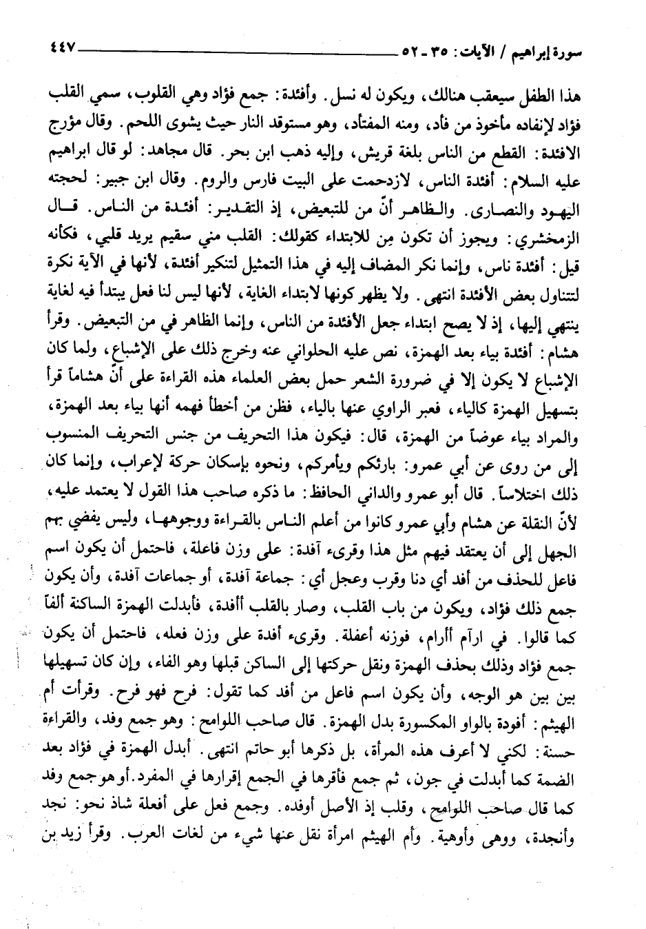 هَذَا الطِّفْلَ سَيُعَقَّبُ هُنَالِكَ، وَيَكُونُ لَهُ نَسْلٌ. وَأَفْئِدَةٌ: جَمْعُ فُؤَادٍ وَهِيَ الْقُلُوبُ، سمي القلب فؤاد لإنفاده مَأْخُوذٌ مِنْ فَأَدَ، وَمِنْهُ الْمُفْتَأَدُ، وَهُوَ مُسْتَوْقَدُ النَّارِ حَيْثُ يُشْوَى اللَّحْمُ. وَقَالَ مُؤَرِّجٌ الْأَفْئِدَةُ: الْقَطْعُ مِنَ النَّاسِ بِلُغَةِ قُرَيْشٍ، وَإِلَيْهِ ذَهَبَ ابْنُ بَحْرٍ. قَالَ مُجَاهِدٌ: لَوْ قَالَ إِبْرَاهِيمُ عَلَيْهِ السَّلَامُ: أَفْئِدَةُ النَّاسِ، لَازْدَحَمَتْ عَلَى الْبَيْتِ فَارِسُ وَالرُّومُ. وَقَالَ ابْنُ جُبَيْرٍ: لَحَجَّتْهُ الْيَهُودُ وَالنَّصَارَى. وَالظَّاهِرُ أَنَّ مِنْ لِلتَّبْعِيضِ، إِذِ التَّقْدِيرُ: أَفْئِدَةٌ مِنَ النَّاسِ. قَالَ الزَّمَخْشَرِيُّ: وَيَجُوزُ أَنْ تَكُونَ مِنْ لِلِابْتِدَاءِ كَقَوْلِكَ: الْقَلْبُ مِنِّي سَقِيمٌ يُرِيدُ قَلْبِي، فَكَأَنَّهُ قِيلَ: أَفْئِدَةُ نَاسٍ، وَإِنَّمَا نَكَّرَ الْمُضَافَ إِلَيْهِ فِي هَذَا التَّمْثِيلِ لِتَنْكِيرِ أَفْئِدَةٍ، لِأَنَّهَا فِي الْآيَةِ نَكِرَةٌ لِتَتَنَاوَلَ بَعْضَ الْأَفْئِدَةِ انْتَهَى. وَلَا يَظْهَرُ كَوْنُهَا لِابْتِدَاءِ الْغَايَةِ، لِأَنَّهَا لَيْسَ لَنَا فِعْلٌ يُبْتَدَأُ فِيهِ لِغَايَةٍ يَنْتَهِي إِلَيْهَا، إِذْ لَا يَصِحُّ ابْتِدَاءً جَعْلُ الْأَفْئِدَةِ مِنَ النَّاسِ، وَإِنَّمَا الظَّاهِرُ فِي مِنْ التبعيض. وقرأ هشام: أفئدة بِيَاءٍ بَعْدَ الْهَمْزَةِ، نَصَّ عَلَيْهِ الْحُلْوَانِيُّ عَنْهُ وَخَرَجَ ذَلِكَ عَلَى الْإِشْبَاعِ، وَلَمَّا كَانَ الْإِشْبَاعُ لَا يَكُونُ إِلَّا فِي ضَرُورَةِ الشِّعْرِ حَمَلَ بَعْضُ الْعُلَمَاءِ هَذِهِ الْقِرَاءَةُ عَلَى أَنَّ هِشَامًا قَرَأَ بِتَسْهِيلِ الْهَمْزَةِ كَالْيَاءِ، فَعَبَّرَ الرَّاوِي عَنْهَا بِالْيَاءِ، فَظَنَّ مَنْ أَخْطَأَ فَهْمَهُ أَنَّهَا بِيَاءٍ بَعْدَ الْهَمْزَةِ، وَالْمُرَادُ بِيَاءٍ عِوَضًا مِنَ الْهَمْزَةِ، قَالَ: فَيَكُونُ هَذَا التَّحْرِيفُ مِنْ جِنْسِ التَّحْرِيفِ الْمَنْسُوبِ إِلَى مَنْ رَوَى عَنْ أَبِي عَمْرٍو: بَارِئُكُمْ وَيَأْمُرُكُمْ، وَنَحْوُهُ بِإِسْكَانِ حَرَكَةِ لإعراب، وَإِنَّمَا كَانَ ذَلِكَ اخْتِلَاسًا. قَالَ أَبُو عَمْرٍو وَالدَّانِيُّ الْحَافِظُ: مَا ذَكَرَهُ صَاحِبُ هَذَا الْقَوْلِ لَا يُعْتَمَدُ عَلَيْهِ، لِأَنَّ النَّقَلَةَ عَنْ هشام وأبي عمرو كانوا مِنْ أَعْلَمِ النَّاسِ بِالْقِرَاءَةِ وَوُجُوهِهَا، وَلَيْسَ يُفْضِي بِهِمُ الْجَهْلُ إِلَى أَنْ يُعْتَقَدَ فيهم مثل هذا وقرىء آفِدَةً: عَلَى وَزْنِ فَاعِلَةٍ، فَاحْتَمَلَ أَنْ يَكُونَ اسْمَ فَاعِلٍ لِلْحَذْفِ مَنْ أَفِدَ أَيْ دَنَا وَقَرُبَ وَعَجِلَ أَيْ: جَمَاعَةٌ آفِدَةٌ، أَوْ جَمَاعَاتٌ آفِدَةٌ، وَأَنْ يَكُونَ جَمْعُ ذَلِكَ فُؤَادٌ، وَيَكُونُ مِنْ بَابِ الْقَلْبِ، وَصَارَ بِالْقَلْبِ أَأْفِدَةً، فَأُبْدِلَتِ الْهَمْزَةُ السَّاكِنَةُ أَلِفًا كَمَا قَالُوا. فِي آرَآمٍ أَأْرَامٍ، فَوَزْنُهُ أعفلة. وقرىء أَفِدَّةٌ عَلَى وَزْنِ فَعِلَّةٌ، فَاحْتَمَلَ أَنْ يَكُونَ جَمْعَ فُؤَادٍ وَذَلِكَ بِحَذْفِ الْهَمْزَةِ وَنَقْلِ حَرَكَتِهَا إِلَى السَّاكِنِ قَبْلَهَا وَهُوَ الْفَاءُ، وَإِنْ كَانَ تَسْهِيلُهَا بَيْنَ بَيْنَ هُوَ الْوَجْهَ، وَأَنْ يَكُونَ اسْمَ فَاعِل مِنْ أَفِدَ كَمَا تَقُولُ: فَرِحَ فَهُوَ فَرِحٌ. وَقَرَأَتْ أُمُّ الْهَيْثَمِ: أَفْوِدَةٌ بِالْوَاوِ الْمَكْسُورَةِ بَدَلَ الْهَمْزَةِ. قَالَ صَاحِبُ اللَّوَامِحِ: وَهُوَ جَمْعُ وَفَدٍ، وَالْقِرَاءَةُ حَسَنَةٌ: لَكِنِّي لَا أَعْرِفُ هَذِهِ الْمَرْأَةَ، بَلْ ذَكَرَهَا أَبُو حَاتِمٍ انْتَهَى. أَبْدَلَ الْهَمْزَةَ فِي فُؤَادٍ بَعْدَ الضَّمَّةِ كَمَا أُبْدِلَتْ فِي جَوْنٍ، ثُمَّ جَمَعَ فَأَقَرَّهَا فِي الْجَمْعِ إِقْرَارَهَا فِي المفر