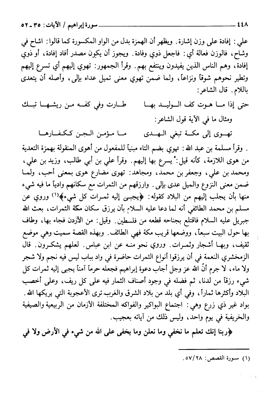 عَلِيٍّ: إِفَادَةٌ عَلَى وَزْنِ إِشَارَةٍ. وَيَظْهَرُ أَنَّ الْهَمْزَةَ بَدَلٌ مِنَ الْوَاوِ الْمَكْسُورَةِ كَمَا قَالُوا: إِشَاحٌ فِي وِشَاحٍ، فَالْوَزْن فِعَالَةٌ أَيْ: فَاجْعَلْ ذَوِي وِفَادَةٍ. وَيَجُوزُ أَنْ يَكُونَ مَصْدَرُ أَفَادَ إِفَادَةً، أَوْ ذَوِي إِفَادَةٍ، وَهُمُ النَّاسُ الَّذِينَ يُفِيدُونَ وَيُنْتَفَعُ بِهِمْ. وَقَرَأَ الْجُمْهُورُ: تَهْوِي إِلَيْهِمْ أَيْ تُسْرِعُ إِلَيْهِمْ وَتَطِيرُ نَحْوَهُمْ شَوْقًا وَنِزَاعًا، وَلَمَّا ضَمَّنَ تَهْوِي مَعْنَى تَمِيلُ عَدَّاهُ بِإِلَى، وَأَصْلُهُ أَنْ يَتَعَدَّى بِاللَّامِ. قَالَ الشَّاعِرُ: