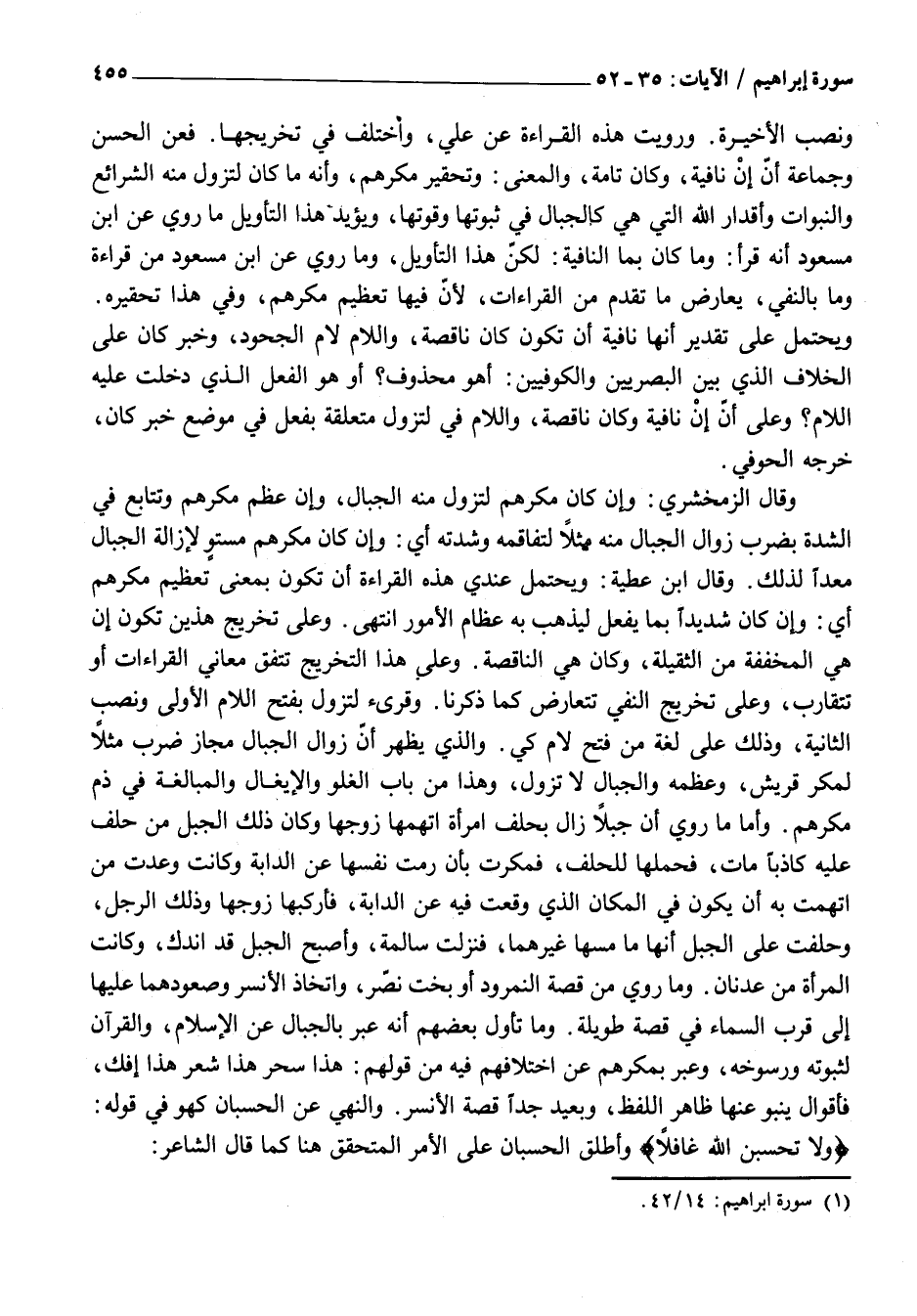 وَقَالَ الزَّمَخْشَرِيُّ: وَإِنْ كَانَ مَكْرُهُمْ لِتَزُولَ مِنْهُ الْجِبَالُ، وَإِنْ عَظُمَ مَكْرُهُمْ وَتَتَابَعَ فِي الشِّدَّةِ بِضَرْبِ زَوَالِ الْجِبَالِ مِنْهُ مَثَلًا لِتَفَاقُمِهِ وَشِدَّتِهِ أَيْ: وَإِنْ كَانَ مَكْرُهُمْ مُسْتَوٍ لِإِزَالَةِ الْجِبَالِ مُعَدًّا لِذَلِكَ. وَقَالَ ابْنُ عَطِيَّةَ: وَيُحْتَمَلُ عِنْدِي هَذِهِ الْقِرَاءَةِ أَنْ تَكُونَ بِمَعْنَى تَعْظِيمِ مَكْرِهِمْ أَيْ: وَإِنْ كَانَ شَدِيدًا بِمَا يَفْعَلُ لِيَذْهَبَ بِهِ عِظَامُ الْأُمُورِ انْتَهَى. وَعَلَى تَخْرِيجِ هَذَيْنِ تَكُونَ أَنْ هِيَ الْمُخَفَّفَةُ مِنَ الثَّقِيلَةِ، وَكَانَ هِيَ النَّاقِصَةُ. وعلى هذا التخريج تنفق مَعَانِي الْقِرَاءَاتِ أَوْ تَتَقَارَبُ، وَعَلَى تَخْرِيجِ النَّفْيِ تَتَعَارَضُ كما ذكرنا. وقرىء لتزول بفتح اللام الأولى وَنَصْبِ الثَّانِيَةِ، وَذَلِكَ عَلَى لُغَةِ مَنْ فَتَحَ لَامَ كَيْ. وَالَّذِي يَظْهَرُ أَنَّ زَوَالَ الْجِبَالِ مَجَازٌ ضُرِبَ مَثَلًا لِمَكْرِ قُرَيْشٍ، وَعِظَمِهِ وَالْجِبَالُ لَا تَزُولُ، وَهَذَا مِنْ بَابِ الْغُلُوِّ وَالْإِيغَالِ وَالْمُبَالَغَةِ فِي ذَمِّ مَكْرِهِمْ. وَأَمَّا مَا رُوِيَ أَنَّ جَبَلًا زَالَ بِحَلِفِ امْرَأَةٍ اتَّهَمَهَا زَوْجُهَا وَكَانَ ذَلِكَ الْجَبَلُ مَنْ حَلَفَ عَلَيْهِ كَاذِبًا مَاتَ، فَحَمَلَهَا لِلْحَلِفِ، فَمَكَرَتْ بِأَنْ رَمَتْ نَفْسَهَا عَنِ الدَّابَّةِ وَكَانَتْ وَعَدَتْ مَنِ اتُّهِمَتْ بِهِ أَنْ يَكُونَ فِي الْمَكَانِ الَّذِي وَقَعَتْ فِيهِ عَنِ الدَّابَّةِ، فَأَرْكَبَهَا زَوْجُهَا وَذَلِكَ الرَّجُلُ، وَحَلَفَتْ عَلَى الْجَبَلِ أَنَّهَا مَا مَسَّهَا غَيْرُهُمَا، فَنَزَلَتْ سَالِمَةً، وَأَصْبَحَ الْجَبَلُ قَدِ انْدَكَّ، وَكَانَتِ الْمَرْأَةُ مِنْ عَدْنَانَ. وَمَا رُوِيَ مِنْ قِصَّةِ النَّمْرُودِ أَوْ بُخْتُ نَصَّرَ، وَاتِّخَاذُ الْأَنْسَرِ وَصُعُودُهُمَا عَلَيْهَا إِلَى قُرْبِ السَّمَاءِ فِي قِصَّةٍ طَوِيلَةٍ. وَمَا تَأَوَّلَ بَعْضُهُمْ أَنَّهُ عَبَّرَ بِالْجِبَالِ عَنِ الْإِسْلَامِ، وَالْقُرْآنِ لِثُبُوتِهِ وَرُسُوخِهِ، وَعَبَّرَ بِمَكْرِهِمْ عَنِ اخْتِلَافِهِمْ فِيهِ مِنْ قَوْلِهِمْ: هَذَا سِحْرٌ هَذَا شِعْرٌ هَذَا إِفْكٌ، فَأَقْوَالٌ يَنْبُو عَنْهَا ظَاهِرُ اللَّفْظِ، وَبِعِيدٌ جِدًّا قِصَّةُ الْأَنْسَرِ. وَالنَّهْيُ عَنِ الْحُسْبَانِ كَهَوَ فِي قَوْلِهِ: