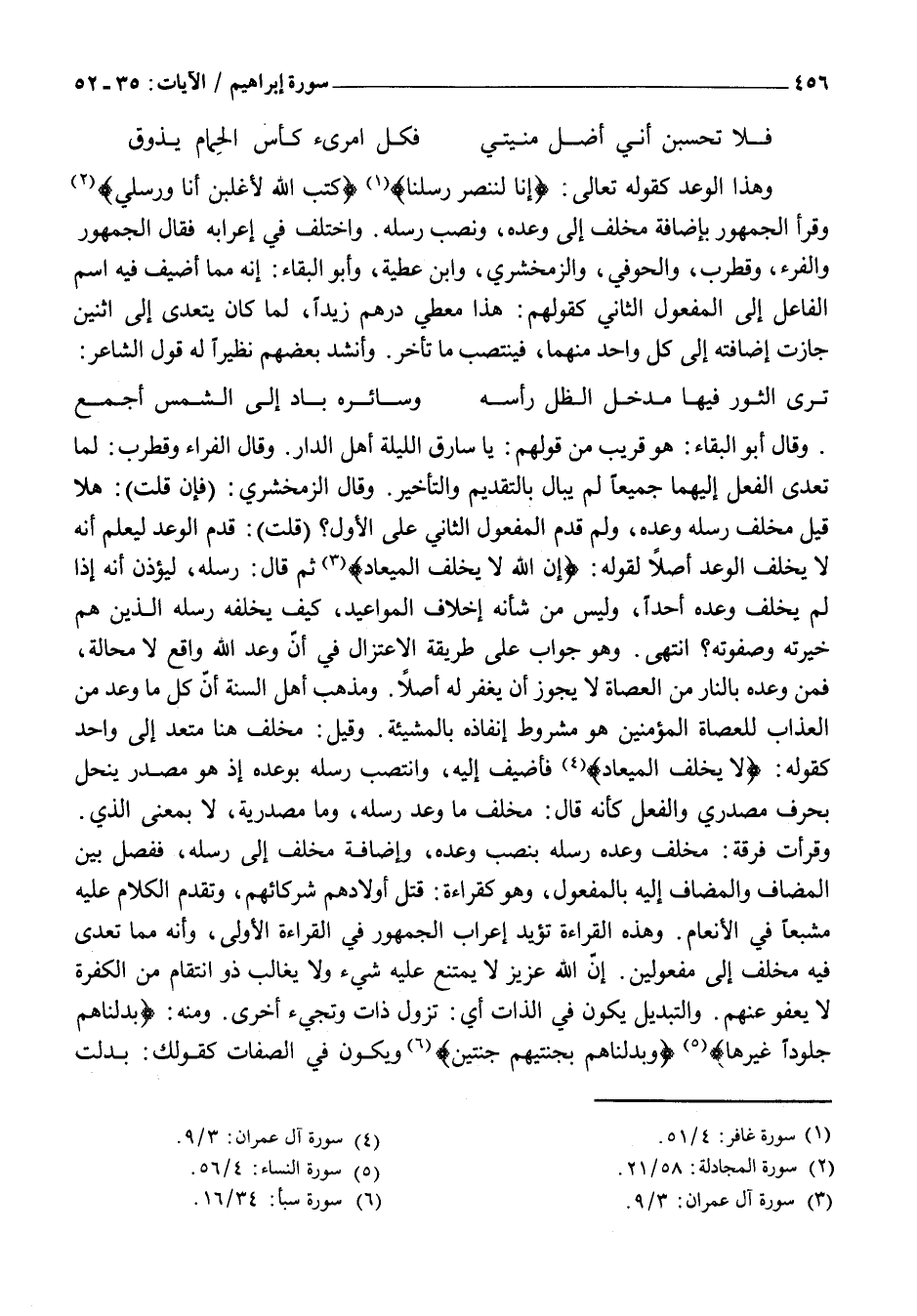 وَهَذَا الْوَعْدُ كَقَوْلِهِ تَعَالَى: إِنَّا لَنَنْصُرُ رُسُلَنا «1» كَتَبَ اللَّهُ لَأَغْلِبَنَّ أَنَا وَرُسُلِي «2» وَقَرَأَ الْجُمْهُورُ بِإِضَافَةِ مُخْلِفَ إِلَى وَعْدِهِ، وَنَصْبِ رُسُلَهُ. وَاخْتُلِفَ فِي إعرابه فقال الجمهور والفراء، وَقُطْرُبٌ، وَالْحَوْفِيُّ، وَالزَّمَخْشَرِيُّ، وَابْنُ عَطِيَّةَ، وَأَبُو الْبَقَاءِ: إِنَّهُ مِمَّا أُضِيفَ فِيهِ اسْمُ الْفَاعِلِ إِلَى الْمَفْعُولِ الثَّانِي كَقَوْلِهِمْ: هَذَا مُعْطِي دِرْهَمٍ زَيْدًا، لَمَّا كَانَ يَتَعَدَّى إِلَى اثْنَيْنِ جَازَتْ إِضَافَتُهُ إِلَى كُلِّ وَاحِدٍ مِنْهُمَا، فَيَنْتَصِبُ مَا تَأَخَّرَ. وَأَنْشَدَ بَعْضُهُمْ نَظِيرًا لَهُ قَوْلَ الشَّاعِرِ: