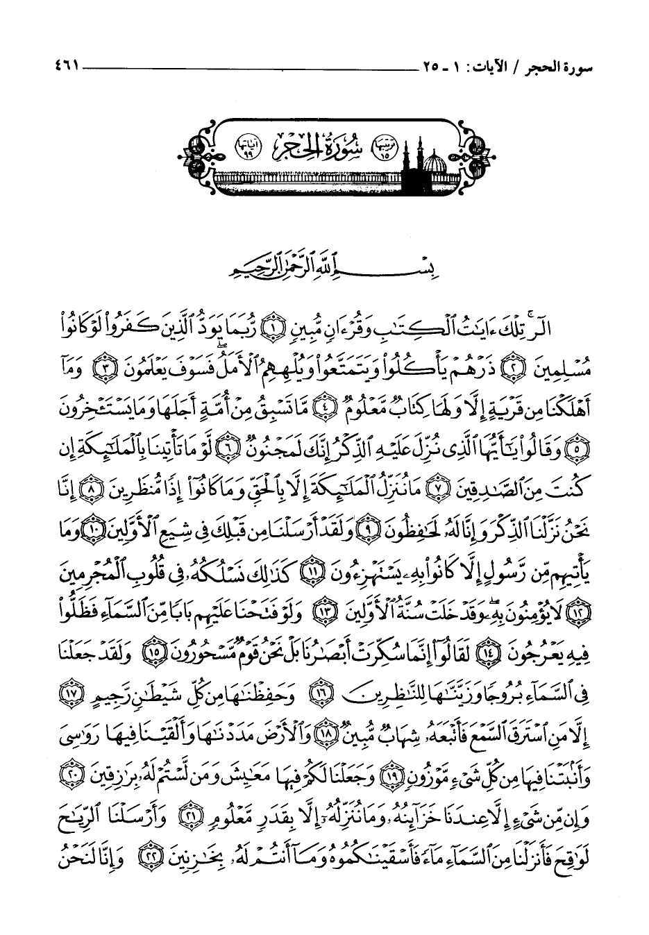 الر تِلْكَ آياتُ الْكِتابِ وَقُرْآنٍ مُبِينٍ (1) رُبَما يَوَدُّ الَّذِينَ كَفَرُوا لَوْ كانُوا مُسْلِمِينَ (2) ذَرْهُمْ يَأْكُلُوا وَيَتَمَتَّعُوا وَيُلْهِهِمُ الْأَمَلُ فَسَوْفَ يَعْلَمُونَ (3) وَما أَهْلَكْنا مِنْ قَرْيَةٍ إِلاَّ وَلَها كِتابٌ مَعْلُومٌ (4)