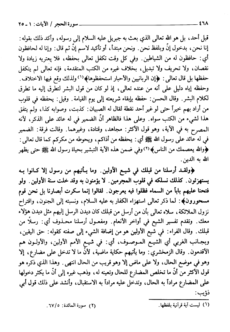 إِنَّا نَحْنُ، بِدُخُولِ إِنَّ وَبِلَفْظِ نَحْنُ. وَنَحْنُ مُبْتَدَأٌ، أَوْ تَأْكِيدٌ لِاسْمٍ إِنَّ ثُمَّ قَالَ: وَإِنَّا لَهُ لَحَافِظُونَ أَيْ: حَافِظُونَ لَهُ مِنَ الشَّيَاطِينِ. وَفِي كُلِّ وَقْتٍ تَكَفَّلَ تَعَالَى بِحِفْظِهِ، فَلَا يَعْتَرِيهِ زِيَادَةٌ وَلَا نُقْصَانٌ، وَلَا تَحْرِيفٌ وَلَا تَبْدِيلٌ، بِخِلَافِ غَيْرِهِ مِنَ الْكُتُبِ الْمُتَقَدِّمَةِ، فَإِنَّهُ تَعَالَى لَمْ يَتَكَفَّلْ حِفْظَهَا بَلْ قَالَ تَعَالَى: إِنَّ الربانيين والأحبار بما اسْتَحْفَظُوهَا «1» وَلِذَلِكَ وَقَعَ فِيهَا الِاخْتِلَافُ.