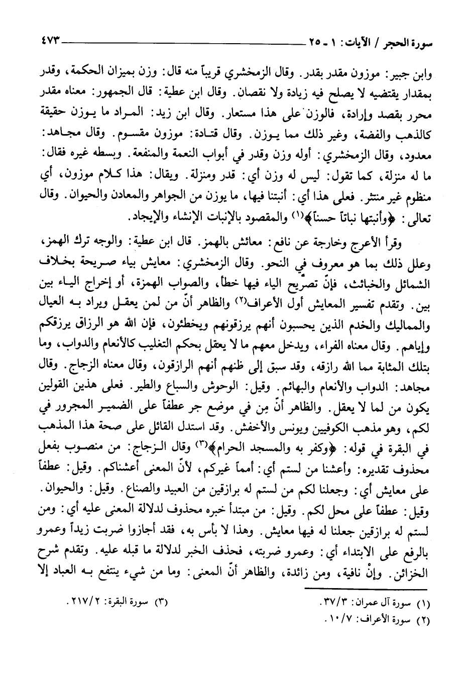 وَابْنُ جُبَيْرٍ: مَوْزُونٍ مُقَدَّرٌ بِقَدْرٍ. وَقَالَ الزَّمَخْشَرِيُّ قَرِيبًا مِنْهُ قَالَ: وُزِنَ بِمِيزَانِ الْحِكْمَةِ، وَقُدِّرَ بِمِقْدَارٍ يَقْتَضِيهِ لَا يَصْلُحُ فِيهِ زِيَادَةٌ وَلَا نُقْصَانٌ. وَقَالَ ابْنُ عَطِيَّةَ: قَالَ الْجُمْهُورُ: مَعْنَاهُ مُقَدَّرٌ مُحَرَّرٌ بِقَصْدٍ وَإِرَادَةٍ، فَالْوَزْنُ عَلَى هَذَا مُسْتَعَارٌ. وَقَالَ ابْنُ زَيْدٍ: الْمُرَادُ مَا يُوزَنُ حَقِيقَةً كَالذَّهَبِ وَالْفِضَّةِ، وَغَيْرِ ذَلِكَ مِمَّا يُوزَنُ. وَقَالَ قَتَادَةُ: مَوْزُونٍ مَقْسُومٌ. وَقَالَ مُجَاهِدٌ: