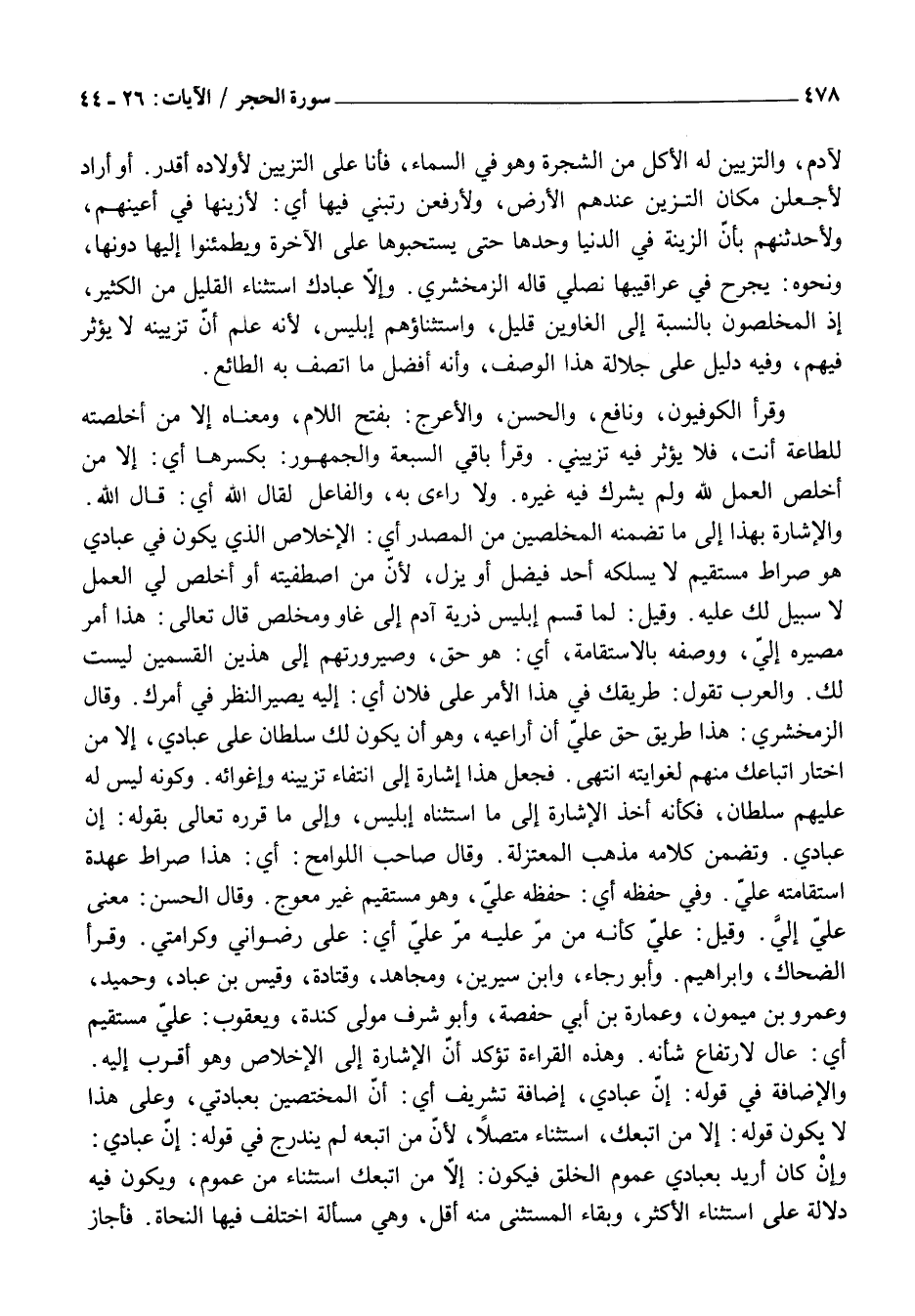 وَالْإِشَارَةُ بِهَذَا إِلَى مَا تَضَمَّنَهُ الْمُخْلَصِينَ مِنَ الْمَصْدَرِ أَيِ: الْإِخْلَاصُ الَّذِي يَكُونُ فِي عِبَادِي هُوَ صِرَاطٌ مُسْتَقِيمٌ لَا يَسْلُكُهُ أَحَدٌ فَيَضِلُّ أَوْ يَزِلُّ، لِأَنَّ مَنِ اصْطَفَيْتُهُ أَوْ أَخْلَصَ لِي الْعَمَلَ لَا سَبِيلَ لَكَ عَلَيْهِ. وَقِيلَ: لَمَّا قَسَّمَ إِبْلِيسُ ذُرِّيَّةَ آدَمَ إِلَى غَاوٍ وَمُخْلَصٍ قَالَ تَعَالَى: هَذَا أَمْرٌ مَصِيرُهُ إِلَيَّ، وَوَصَفَهُ بِالِاسْتِقَامَةِ، أَيْ: هُوَ حَقٌّ، وَصَيْرُورَتُهُمْ إِلَى هَذَيْنِ الْقِسْمَيْنِ لَيْسَتْ لَكَ. وَالْعَرَبُ تَقُولُ: طَرِيقُكَ فِي هَذَا الْأَمْرِ عَلَى فُلَانٍ أَيْ: إِلَيْهِ يَصِيرُ النَّظَرُ فِي أَمْرِكَ. وَقَالَ الزَّمَخْشَرِيُّ: هَذَا طَرِيقٌ حَقٌّ عَلَيَّ أَنْ أُرَاعِيَهُ، وَهُوَ أَنْ يَكُونَ لَكَ سُلْطَانٌ عَلَى عِبَادِي، إِلَّا مَنِ اخْتَارَ اتِّبَاعَكَ مِنْهُمْ لِغَوَايَتِهِ انْتَهَى. فَجَعَلَ هَذَا إِشَارَةً إِلَى انْتِفَاءِ تَزْيِينِهِ وَإِغْوَائِهِ. وَكَوْنِهِ لَيْسَ لَهُ عَلَيْهِمْ سُلْطَانٌ، فَكَأَنَّهُ أَخَذَ الْإِشَارَةَ إِلَى مَا اسْتَثْنَاهُ إِبْلِيسُ، وَإِلَى مَا قَرَّرَهُ تَعَالَى بِقَوْلِهِ: إِنَّ عِبَادِي. وَتَضَمَّنَ كَلَامُهُ مَذْهَبَ الْمُعْتَزِلَةِ. وَقَالَ صَاحِبُ اللَّوَامِحِ: أَيْ: هَذَا صِرَاطٌ عُهْدَةُ اسْتِقَامَتِهِ عَلَيَّ. وَفِي حِفْظِهِ أَيْ: حِفْظُهُ عَلَيَّ، وَهُوَ مُسْتَقِيمٌ غَيْرُ مُعْوَجٍّ. وَقَالَ الْحَسَنُ: مَعْنَى عَلَيَّ إِلَيَّ. وَقِيلَ: عَلَيَّ كَأَنَّهُ مَنْ مَرَّ عَلَيْهِ مَرَّ عَلَيَّ أَيْ: عَلَى رِضْوَانِي وَكَرَامَتِي. وَقَرَأَ الضَّحَّاكُ، وَإِبْرَاهِيمُ. وَأَبُو رَجَاءٍ، وَابْنِ سِيرِينَ، وَمُجَاهِدٍ، وَقَتَادَةَ، وَقَيْسُ بْنُ عَبَّادٍ، وَحُمَيْدٌ، وَعَمْرُو بْنُ مَيْمُونٍ، وَعِمَارَةُ بْنُ أَبِي حَفْصَةَ، وَأَبُو شَرَفٍ مَوْلَى كِنْدَةَ، وَيَعْقُوبُ: عَلَيَّ مُسْتَقِيمٌ أَيْ: عَالٍ لِارْتِفَاعِ شَأْنِهِ. وَهَذِهِ الْقِرَاءَةُ تُؤَكِّدُ أَنَّ الْإِشَارَةَ إِلَى الْإِخْلَاصِ وَهُوَ أَقْرَبُ إِلَيْهِ.