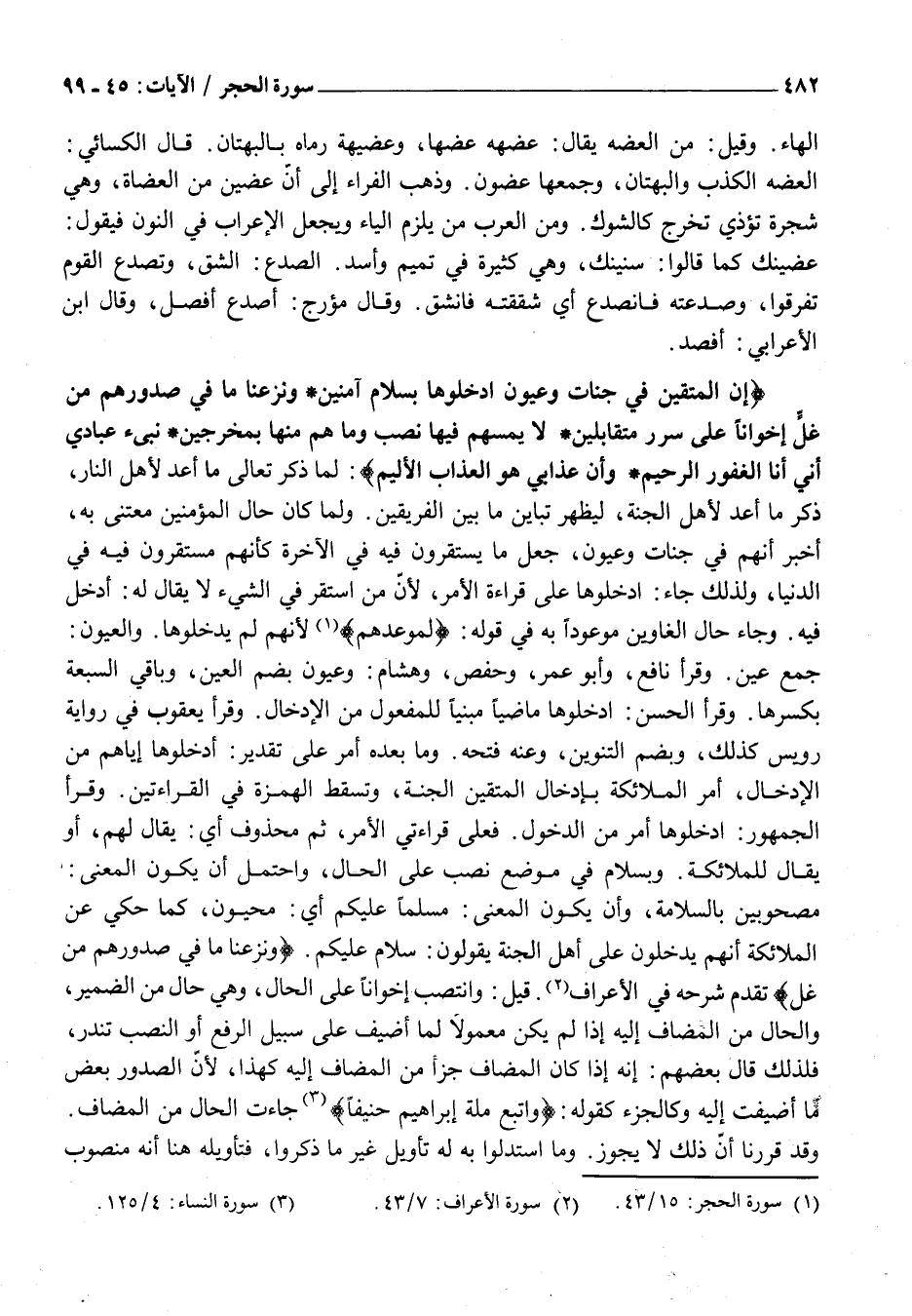 مَصْحُوبِينَ بِالسَّلَامَةِ، وَأَنْ يَكُونَ الْمَعْنَى: مُسَلَّمًا عَلَيْكُمْ أَيْ: مُحَيَّوْنَ، كَمَا حُكِيَ عَنِ الْمَلَائِكَةِ أَنَّهُمْ يَدْخُلُونَ عَلَى أَهْلِ الْجَنَّةِ يَقُولُونَ: سَلَامٌ عَلَيْكُمْ. وَنَزَعْنا مَا فِي صُدُورِهِمْ مِنْ غِلٍّ تَقَدَّمَ شَرْحُهُ فِي الْأَعْرَافِ «2» . قِيلَ: وَانْتَصَبَ إِخْوَانًا عَلَى الْحَالِ، وَهِيَ حَالٌ مِنَ الضَّمِيرِ، وَالْحَالُ مِنَ الْمُضَافِ إِلَيْهِ إِذَا لَمْ يَكُنْ مَعْمُولًا لِمَا أُضِيفَ عَلَى سَبِيلِ الرَّفْعِ أَوِ النَّصْبِ تَنْدُرُ، فَلِذَلِكَ قَالَ بَعْضُهُمْ: أَنَّهُ إِذَا كَانَ المضاف جزأ مِنَ الْمُضَافِ إِلَيْهِ كَهَذَا، لِأَنَّ الصُّدُورَ بَعْضُ مَا أُضِيفَتْ إِلَيْهِ وَكَالْجُزْءِ كَقَوْلِهِ: وَاتَّبَعَ مِلَّةَ إِبْراهِيمَ حَنِيفاً «3» جَاءَتِ الْحَالُ مِنَ الْمُضَافِ.