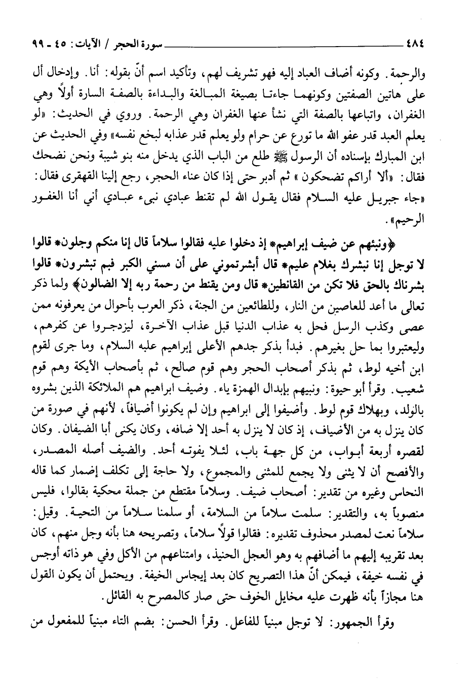 وَنَبِّئْهُمْ عَنْ ضَيْفِ إِبْراهِيمَ إِذْ دَخَلُوا عَلَيْهِ فَقالُوا سَلاماً قالَ إِنَّا مِنْكُمْ وَجِلُونَ قالُوا لَا تَوْجَلْ إِنَّا نُبَشِّرُكَ بِغُلامٍ عَلِيمٍ قالَ أَبَشَّرْتُمُونِي عَلى أَنْ مَسَّنِيَ الْكِبَرُ فَبِمَ تُبَشِّرُونَ قالُوا بَشَّرْناكَ بِالْحَقِّ فَلا تَكُنْ مِنَ الْقانِطِينَ قالَ وَمَنْ يَقْنَطُ مِنْ رَحْمَةِ رَبِّهِ إِلَّا الضَّالُّونَ وَلَمَّا ذَكَرَ تَعَالَى مَا أَعَدَّ لِلْعَاصِينَ مِنَ النَّارِ، وَلِلطَّائِعِينَ مِنَ الْجَنَّةِ، ذَكَّرَ الْعَرَبَ بِأَحْوَالِ مَنْ يَعْرِفُونَهُ مِمَّنْ عَصَى وَكَذَبَ الرُّسُلَ فَحَلَّ بِهِ عَذَابُ الدُّنْيَا قَبْلَ عَذَابِ الْآخِرَةِ، لِيَزْدَجِرُوا عَنْ كُفْرِهِمْ، وَلِيَعْتَبِرُوا بِمَا حَلَّ بِغَيْرِهِمْ. فَبَدَأَ بِذِكْرِ جَدِّهِمُ الْأَعْلَى إِبْرَاهِيمَ عَلَيْهِ السَّلَامُ، وَمَا جَرَى لِقَوْمِ ابْنِ أَخِيهِ لُوطٍ، ثُمَّ بِذِكْرِ أَصْحَابِ الْحِجْرِ وَهُمْ قَوْمُ صَالِحٍ، ثُمَّ بِأَصْحَابِ الْأَيْكَةِ وَهُمْ قَوْمُ شُعَيْبٍ. وَقَرَأَ أَبُو حَيْوَةَ: وَنَبِيُّهُمْ بِإِبْدَالِ الْهَمْزَةِ يَاءً. وَضَيْفُ إِبْرَاهِيمَ هُمُ الْمَلَائِكَةُ الَّذِينَ بَشَّرُوهُ بِالْوَلَدِ، وَبِهَلَاكِ قَوْمِ لُوطٍ. وَأُضِيفُوا إِلَى إِبْرَاهِيمَ وَإِنْ لَمْ يَكُونُوا أَضْيَافًا، لِأَنَّهُمْ فِي صُورَةِ مَنْ كَانَ يَنْزِلُ بِهِ مِنَ الْأَضْيَافِ، إِذْ كَانَ لَا يَنْزِلُ بِهِ أَحَدٌ إِلَّا ضَافَهُ، وَكَانَ يُكَنَّى أَبَا الضِّيفَانِ. وَكَانَ لِقَصْرِهِ أَرْبَعَةُ أَبْوَابٍ، مِنْ كُلِّ جِهَةٍ بَابٌ، لِئَلَّا يَفُوتَهُ أَحَدٌ. وَالضَّيْفُ أَصْلُهُ الْمَصْدَرُ، وَالْأَفْصَحُ أَنْ لَا يُثَنَّى وَلَا يُجْمَعُ لِلْمُثَنَّى وَالْمَجْمُوعِ، وَلَا حَاجَةَ إِلَى تَكَلُّفِ إِضْمَارٍ كَمَا قَالَهُ النَّحَّاسُ وَغَيْرُهُ مِنْ تَقْدِيرِ: أَصْحَابِ ضَيْفٍ. وَسَلَامًا مُقْتَطِعٌ مِنْ جُمْلَةٍ مَحْكِيَّةٍ بِقَالُوا، فَلَيْسَ مَنْصُوبًا بِهِ، وَالتَّقْدِيرُ: سَلَّمْتُ سَلَامًا مِنَ السَّلَامَةِ، أَوْ سَلَّمْنَا سَلَامًا مِنَ التَّحِيَّةِ. وَقِيلَ: