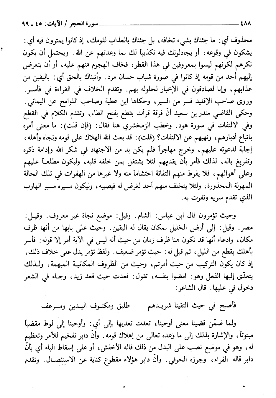 وَلَمَّا ضَمَّنَ قَضَيْنَا مَعْنَى أَوْحَيْنَا، تَعَدَّتْ تَعَدِّيَهَا بِإِلَى أَيْ: وَأَوْحَيْنَا إِلَى لُوطٍ مَقْضِيًّا مَبْتُوتًا، وَالْإِشَارَةُ بِذَلِكَ إِلَى مَا وَعَدَهُ تَعَالَى مِنْ إِهْلَاكِ قَوْمِهِ. وأنّ دَابِرَ تَفْخِيمٌ لِلْأَمْرِ وَتَعْظِيمٌ لَهُ، وَهُوَ فِي مَوْضِعِ نَصْبٍ عَلَى الْبَدَلِ مِنْ ذَلِكَ قَالَهُ الْأَخْفَشُ، أَوْ عَلَى إِسْقَاطِ الْبَاءِ أَيْ بأنّ دابر قَالَهُ الْفَرَّاءُ، وَجَوَّزَهُ الْحَوْفِيُّ. وَأَنَّ دَابِرَ هَؤُلَاءِ مَقْطُوعٌ كِنَايَةً عَنِ الِاسْتِئْصَالِ. وَتَقَدَّمَ