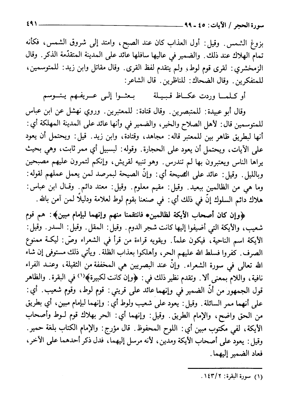 عَلَى أَنَّهُمَا مَمَرُّ السَّائِلَةِ. وَقِيلَ: يَعُودُ عَلَى شُعَيْبٍ وَلُوطٍ أَيْ: وَإِنَّهُمَا لَبِإِمَامٍ مُبِينٍ، أَيْ بِطَرِيقٍ مِنَ الْحَقِّ وَاضِحٍ، وَالْإِمَامُ الطَّرِيقُ. وَقِيلَ: وَإِنَّهُمَا أَيْ: الْحَرُّ بِهَلَاكِ قَوْمِ لُوطٍ وَأَصْحَابِ الْأَيْكَةِ، لَفِي مَكْتُوبٍ مُبِينٍ أَيِ: اللَّوْحِ الْمَحْفُوظِ. قَالَ مُؤَرِّجٌ: وَالْإِمَامُ الْكِتَابُ بِلُغَةِ حِمْيَرَ.