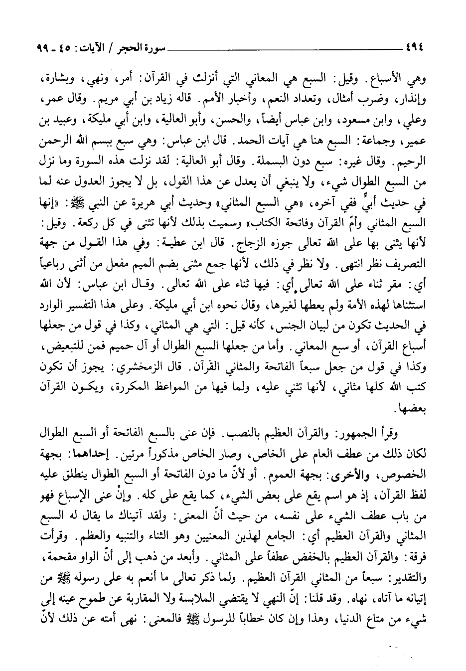 وَقَرَأَ الْجُمْهُورُ: وَالْقُرْآنَ الْعَظِيمَ بِالنَّصْبِ. فَإِنْ عَنَى بِالسَّبْعِ الفاتحة أو السبع الطوال لَكَانَ ذَلِكَ مِنْ عَطْفَ الْعَامِّ عَلَى الْخَاصِّ، وَصَارَ الْخَاصُّ مَذْكُورًا مَرَّتَيْنِ. إِحْدَاهُمَا: بِجِهَةِ الْخُصُوصِ، وَالْأُخْرَى: بِجِهَةِ الْعُمُومِ. أَوْ لِأَنَّ مَا دُونَ الْفَاتِحَةِ أَوِ السَّبْعِ الطِّوَالِ يَنْطَلِقُ عَلَيْهِ لَفْظُ الْقُرْآنِ، إِذْ هُوَ اسْمٌ يَقَعُ عَلَى بَعْضِ الشَّيْءِ، كَمَا يَقَعُ عَلَى كُلِّهِ. وَإِنْ عَنَى الْإِسْبَاعَ فَهُوَ مِنْ بَابِ عَطْفُ الشَّيْءِ عَلَى نَفْسِهِ، مِنْ حَيْثُ إِنَّ الْمَعْنَى: وَلَقَدْ آتَيْنَاكَ مَا يُقَالُ لَهُ السَّبْعُ الْمَثَانِي وَالْقُرْآنُ الْعَظِيمُ أَيِ: الْجَامِعُ لِهَذَيْنِ الْمَعْنَيَيْنِ وَهُوَ الثَّنَاءُ وَالتَّنْبِيهُ وَالْعِظَمُ. وَقَرَأَتْ فِرْقَةٌ: وَالْقُرْآنِ الْعَظِيمِ بِالْخَفْضِ عَطْفًا عَلَى الْمَثَانِي. وَأَبْعَدَ مَنْ ذَهَبَ إِلَى أَنَّ الْوَاوَ مُقْحَمَةٌ، وَالتَّقْدِيرُ: سَبْعًا مِنَ الْمَثَانِي الْقُرْآنِ الْعَظِيمِ. وَلَمَّا ذَكَرَ تَعَالَى مَا أَنْعَمَ بِهِ عَلَى رَسُولِهِ صَلَّى اللَّهُ عَلَيْهِ وَسَلَّمَ مِنْ إِتْيَانِهِ مَا آتَاهُ، نَهَاهُ. وَقَدْ قُلْنَا: إِنَّ النَّهْيَ لَا يَقْتَضِي الْمُلَابَسَةَ وَلَا الْمُقَارَبَةَ عَنْ طُمُوحِ عَيْنِهِ إِلَى شَيْءٍ مِنْ مَتَاعِ الدُّنْيَا، وَهَذَا وَإِنْ كَانَ خِطَابًا لِلرَّسُولِ صَلَّى اللَّهُ عَلَيْهِ وَسَلَّمَ فَالْمَعْنَى: نَهَى أُمَّتَهُ عَنْ ذَلِكَ لِأَنَّ