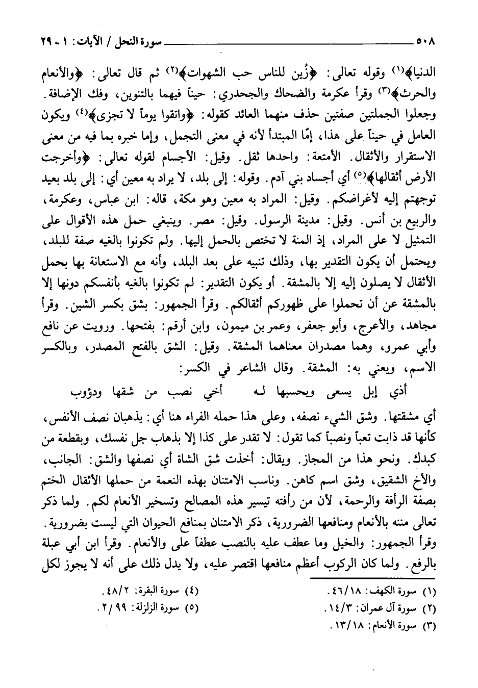 أَيْ مَشَقَّتِهَا. وَشِقُّ الشَّيْءِ نِصْفُهُ، وَعَلَى هَذَا حَمَلَهُ الْفَرَّاءُ هُنَا أَيْ: يُذْهِبَانِ نِصْفَ الْأَنْفُسِ، كَأَنَّهَا قَدْ ذَابَتْ تَعَبًا وَنَصَبًا كَمَا تَقُولُ: لَا تَقْدِرُ عَلَى كَذَا إِلَّا بِذَهَابِ جُلِّ نَفْسِكَ، وَبِقِطْعَةٍ مِنْ كَبِدِكَ. وَنَحْوِ هَذَا مِنَ الْمَجَازِ. وَيُقَالُ: أَخَذْتُ شِقَّ الشَّاةِ أَيْ نِصْفَهَا وَالشِّقُّ: الْجَانِبُ، وَالْأَخُ الشَّقِيقُ، وَشَقٌّ اسْمُ كَاهِنٍ. وَنَاسَبَ الِامْتِنَانَ بِهَذِهِ النِّعْمَةِ مِنْ حَمْلِهَا الْأَثْقَالَ الْخَتْمُ بِصِفَةِ الرَّأْفَةِ وَالرَّحْمَةِ، لِأَنَّ مِنْ رَأْفَتِهِ تَيْسِيرُ هَذِهِ الْمَصَالِحِ وَتَسْخِيرُ الْأَنْعَامِ لَكُمْ. وَلَمَّا ذَكَرَ تَعَالَى مِنَنَهُ بِالْأَنْعَامِ وَمَنَافِعَهَا الضَّرُورِيَّةِ، ذَكَرَ الِامْتِنَانَ بِمَنَافِعِ الْحَيَوَانِ الَّتِي لَيْسَتْ بِضَرُورِيَّةٍ.