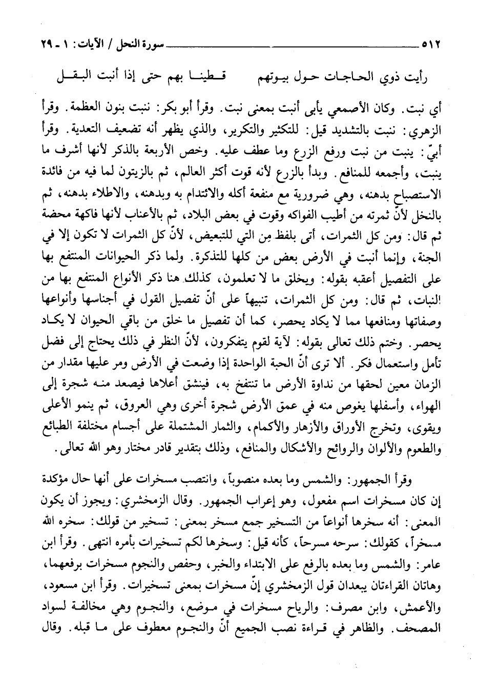 أَيْ نَبَتَ. وَكَانَ الْأَصْمَعِيُّ يَأْبَى أَنْبَتَ بِمَعْنَى نَبَتَ. وَقَرَأَ أَبُو بَكْرٍ: نُنْبِتُ بِنُونِ الْعَظَمَةِ. وَقَرَأَ الزُّهْرِيُّ: نُنَبِّتُ بِالتَّشْدِيدِ قِيلَ: لِلتَّكْثِيرِ وَالتَّكْرِيرِ، وَالَّذِي يَظْهَرُ أَنَّهُ تَضْعِيفُ التَّعْدِيَةِ. وَقَرَأَ أُبَيٌّ: يَنْبُتُ مِنْ نَبَتَ وَرَفَعَ الزرع وما عطف عليه. وَخَصَّ الْأَرْبَعَةَ بِالذِّكْرِ لِأَنَّهَا أَشْرَفُ مَا يَنْبُتُ، وَأَجْمَعُهُ لِلْمَنَافِعِ. وَبَدَأَ بِالزَّرْعِ لِأَنَّهُ قُوتُ أَكْثَرِ الْعَالَمِ، ثُمَّ بِالزَّيْتُونِ لِمَا فِيهِ مِنْ فَائِدَةِ الِاسْتِصْبَاحِ بِدُهْنِهِ، وَهِيَ ضَرُورِيَّةٌ مَعَ مَنْفَعَةِ أَكْلِهِ وَالِائْتِدَامِ بِهِ وَبِدَهْنِهِ، وَالِاطِّلَاءِ بِدُهْنِهِ، ثُمَّ بِالنَّخْلِ لِأَنَّ ثَمَرَتَهُ مِنْ أَطْيَبِ الْفَوَاكِهِ وَقُوتٌ فِي بَعْضِ الْبِلَادِ، ثُمَّ بِالْأَعْنَابِ لِأَنَّهَا فَاكِهَةٌ مَحْضَةٌ ثُمَّ قَالَ: وَمِنْ كُلِّ الثَّمَرَاتِ، أَتَى بِلَفْظِ مِنْ الَّتِي لِلتَّبْعِيضِ، لِأَنَّ كُلَّ الثَّمَرَاتِ لَا تَكُونُ إِلَّا فِي الْجَنَّةِ، وَإِنَّمَا أُنْبِتَ فِي الْأَرْضِ بَعْضٌ مِنْ كُلِّهَا لِلتَّذْكِرَةِ. وَلَمَّا ذَكَرَ الْحَيَوَانَاتِ الْمُنْتَفَعِ بِهَا عَلَى التَّفْصِيلِ أَعْقَبَهُ بِقَوْلِهِ: وَيَخْلُقُ مَا لَا تَعْلَمُونَ، كَذَلِكَ هُنَا ذَكَرَ الْأَنْوَاعَ الْمُنْتَفَعَ بِهَا مِنَ النَّبَاتِ، ثُمَّ قَالَ: وَمِنْ كُلِّ الثَّمَرَاتِ، تَنْبِيهًا عَلَى أَنَّ تَفْصِيلَ الْقَوْلِ فِي أَجْنَاسِهَا وَأَنْوَاعِهَا وَصِفَاتِهَا وَمَنَافِعهَا مِمَّا لَا يَكَادُ يُحْصَرُ، كَمَا أَنَّ تَفْصِيلَ مَا خَلَقَ مِنْ بَاقِي الْحَيَوَانِ لَا يَكَادُ يُحْصَرُ. وَخَتَمَ ذَلِكَ تَعَالَى بِقَوْلِهِ: لَآيَةً لِقَوْمٍ يَتَفَكَّرُونَ، لِأَنَّ النَّظَرَ فِي ذَلِكَ يَحْتَاجُ إِلَى فَضْلِ تَأَمُّلٍ وَاسْتِعْمَالِ فِكْرٍ. أَلَا تَرَى أَنَّ الْحَبَّةَ الْوَاحِدَةَ إِذَا وُضِعَتْ فِي الْأَرْضِ وَمَرَّ عَلَيْهَا مِقْدَارٌ مِنَ الزَّمَانِ مُعَيَّنٌ لَحِقَهَا مِنْ نَدَاوَةِ الْأَرْضِ مَا تَنْتَفِخُ بِهِ، فَيَنْشَقُّ أَعْلَاهَا فَيَصْعَدُ مِنْهُ شَجَرَةٌ إِلَى الْهَوَاءِ، وَأَسْفَلُهَا يَغُوصُ مِنْهُ فِي عُمْقِ الْأَرْضِ شَجَرَةٌ أُخْرَى وَهِيَ الْعُرُوقُ، ثُمَّ يَنْمُو الْأَعْلَى وَيَقْوَى، وَتَخْرُجُ الْأَوْرَاقُ وَالْأَزْهَارُ وَالْأَكْمَامُ، وَالثِّمَارُ الْمُشْتَمِلَةُ عَلَى أَجْسَامٍ مُخْتَلِفَةِ الطَّبَائِعِ وَالطُّعُومِ وَالْأَلْوَانِ وَالرَّوَائِحِ وَالْأَشْكَالِ وَالْمَنَافِعِ، وَذَلِكَ بِتَقْدِيرِ قَادِرٍ مُخْتَارٍ وَهُوَ اللَّهِ تَعَالَى.