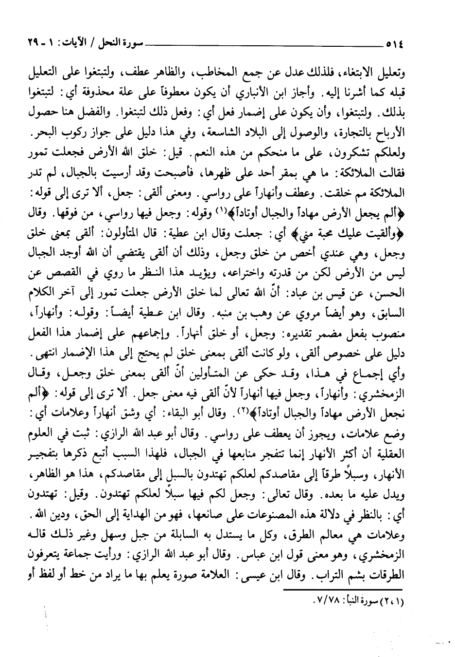 وَضَعَ عَلَامَاتٍ، وَيَجُوزُ أَنْ يُعْطَفَ عَلَى رَوَاسِيَ. وَقَالَ أَبُو عَبْدِ اللَّهِ الرَّازِيُّ: ثَبَتَ فِي الْعُلُومِ الْعَقْلِيَّةِ أَنَّ أَكْثَرَ الْأَنْهَارِ إِنَّمَا تَتَفَجَّرُ مَنَابِعُهَا فِي الْجِبَالِ، فَلِهَذَا السَّبَبِ أَتْبَعَ ذِكْرَهَا بِتَفْجِيرِ الْأَنْهَارِ، وَسُبُلًا طُرُقًا إِلَى مَقَاصِدِكُمْ لَعَلَّكُمْ تَهْتَدُونَ بِالسُّبُلِ إِلَى مَقَاصِدِكُمْ، هَذَا هُوَ الظَّاهِرُ، وَيَدُلُّ عَلَيْهِ مَا بَعْدَهُ. وَقَالَ تَعَالَى: وَجَعَلَ لَكُمْ فِيهَا سُبُلًا لَعَلَّكُمْ تَهْتَدُونَ. وَقِيلَ: تَهْتَدُونَ أَيْ: بِالنَّظَرِ فِي دَلَالَةِ هَذِهِ الْمَصْنُوعَاتِ عَلَى صَانِعِهَا، فَهُوَ مِنَ الْهِدَايَةِ إِلَى الْحَقِّ، وَدِينِ اللَّهِ.