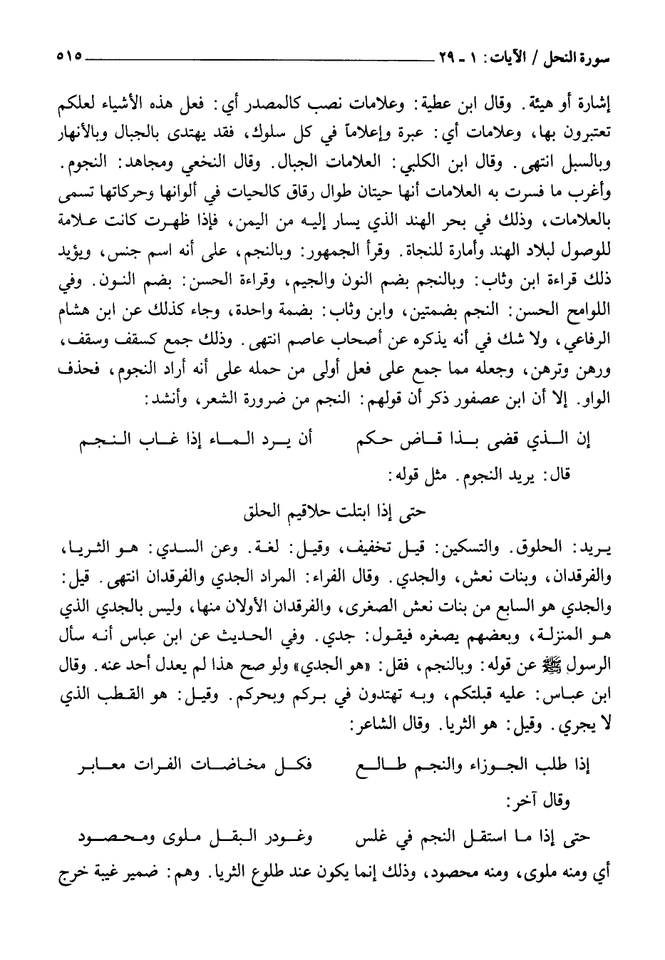 وَأَغْرَبُ مَا فُسِّرَتْ بِهِ الْعَلَامَاتُ أَنَّهَا حَيَّتَانِ طُوَالٌ رِقَاقٌ كَالْحَيَّاتِ فِي أَلْوَانِهَا وَحَرَكَاتِهَا تُسَمَّى بِالْعَلَامَاتِ، وَذَلِكَ فِي بَحْرِ الْهِنْدِ الَّذِي يُسَارُ إِلَيْهِ مِنَ الْيَمَنِ، فَإِذَا ظَهَرَتْ كَانَتْ عَلَامَةً لِلْوُصُولِ لِبِلَادِ الْهِنْدِ وَأَمَارَةً لِلنَّجَاةِ. وَقَرَأَ الْجُمْهُورُ: وَبِالنَّجْمِ، عَلَى أَنَّهُ اسْمُ جِنْسٍ، وَيُؤَيِّدُ ذَلِكَ قِرَاءَةُ ابْنِ وَثَّابٍ: وَبِالنُّجُمِ بِضَمِّ النُّونِ وَالْجِيمِ، وَقِرَاءَةُ الْحَسَنِ: بِضَمِّ النُّونِ. وَفِي اللَّوَامِحِ الْحَسَنُ: النُّجُمُ بِضَمَّتَيْنِ، وَابْنُ وَثَّابٍ: بِضَمَّةٍ وَاحِدَةٍ، وَجَاءَ كَذَلِكَ عَنِ ابْنِ هِشَامٍ الرِّفَاعِيِّ، وَلَا شَكَّ فِي أَنَّهُ يَذْكُرُهُ عَنْ أَصْحَابِ عَاصِمٍ انْتَهَى. وَذَلِكَ جَمْعٌ كَسُقُفٍ وَسَقَفِ، وَرُهُنٍ وترهن، وَجَعْلُهُ مِمَّا جُمِعَ عَلَى فُعُلٍ أَوْلَى مِنْ حَمْلِهِ عَلَى أَنَّهُ أَرَادَ النُّجُومَ، فَحَذَفَ الْوَاوَ. إِلَّا أَنَّ ابْنَ عُصْفُورٍ ذَكَرَ أَنَّ قَوْلَهُمْ: النُّجُمُ مِنْ ضَرُورَةِ الشِّعْرِ، وَأَنْشَدَ: