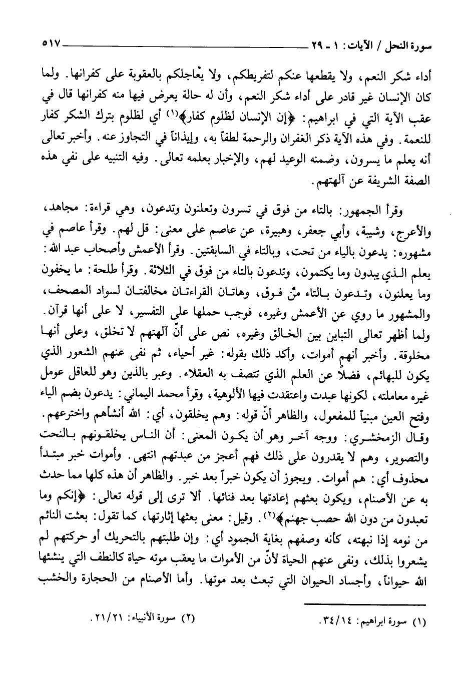 وَلَمَّا أَظْهَرَ تَعَالَى التَّبَايُنَ بَيْنَ الْخَالِقِ وَغَيْرِهِ، نَصَّ عَلَى أَنَّ آلِهَتَهُمْ لَا تَخْلُقُ، وَعَلَى أَنَّهَا مَخْلُوقَةٌ. وَأَخْبَرَ أَنَّهُمْ أَمْوَاتٌ، وَأَكَّدَ ذَلِكَ بِقَوْلِهِ: غَيْرُ أَحْيَاءٍ، ثُمَّ نَفَى عَنْهُمُ الشُّعُورَ الَّذِي يَكُونُ لِلْبَهَائِمِ، فَضْلًا عَنِ الْعِلْمِ الَّذِي تَتَّصِفُ بِهِ الْعُقَلَاءُ. وَعَبَّرَ بِالَّذِينِ وَهُوَ لِلْعَاقِلِ عُومِلَ غَيْرُهُ مُعَامَلَتَهُ، لِكَوْنِهَا عُبِدَتْ وَاعْتُقِدَتْ فِيهَا الْأُلُوهِيَّةُ، وَقَرَأَ مُحَمَّدٌ الْيَمَانِيُّ: يُدْعَوْنَ بِضَمِّ الْيَاءِ وَفَتَحَ الْعَيْنَ مَبْنِيًّا لِلْمَفْعُولِ، وَالظَّاهِرُ أَنَّ قَوْلَهُ: وَهُمْ يُخْلَقُونَ، أَيِ: اللَّهُ أَنْشَأَهُمْ وَاخْتَرَعَهُمْ.