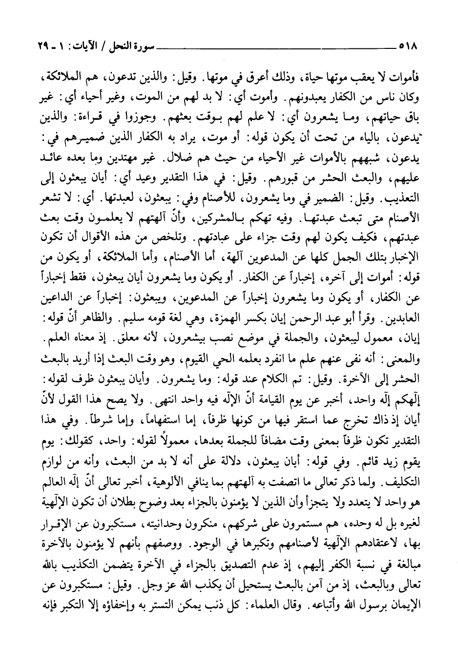 يَدْعُونَ، شَبَّهَهُمْ بِالْأَمْوَاتِ غَيْرِ الْأَحْيَاءِ مِنْ حَيْثُ هُمْ ضُلَّالٌ. غَيْرُ مُهْتَدِينَ وَمَا بَعْدَهُ عَائِدٌ عَلَيْهِمْ، وَالْبَعْثُ الْحَشْرُ مِنْ قُبُورِهِمْ. وَقِيلَ: فِي هَذَا التَّقْدِيرِ وَعِيدٌ أَيْ: أَيَّانَ يُبْعَثُونَ إِلَى التَّعْذِيبِ. وَقِيلَ: الضَّمِيرُ فِي وَمَا يَشْعُرُونَ، لِلْأَصْنَامِ وَفِي: يُبْعَثُونَ، لِعَبَدَتِهَا. أَيْ: لَا تَشْعُرُ الْأَصْنَامُ مَتَى تُبْعَثُ عَبَدَتُهَا. وَفِيهِ تَهَكُّمٌ بِالْمُشْرِكِينَ، وَأَنَّ آلِهَتَهُمْ لَا يَعْلَمُونَ وَقْتَ بَعْثِ عَبَدَتِهِمْ، فَكَيْفَ يَكُونُ لَهُمْ وَقْتُ جَزَاءٍ عَلَى عِبَادَتِهِمْ. وَتَلَخَّصَ مِنْ هَذِهِ الْأَقْوَالِ أَنَّ تَكُونَ الْأَخْبَارُ بِتِلْكَ الجمل كلها عن الْمَدْعُوِّينَ آلِهَةً، إِمَّا الْأَصْنَامُ، وَإِمَّا الْمَلَائِكَةُ، أَوْ يَكُونُ مِنْ قَوْلِهِ: أَمْوَاتٌ إِلَى آخره، إخبارا عن الكفار. أو يكون وَمَا يَشْعُرُونَ أَيَّانَ يُبْعَثُونَ، فقط إخبارا عن الكفار، أو يكون وما يشعرون إِخْبَارًا عَنِ الْمَدْعُوِّينَ، وَيُبْعَثُونَ: إِخْبَارًا عَنِ الدَّاعِينَ الْعَابِدِينَ. وَقَرَأَ أَبُو عَبْدِ الرَّحْمَنِ إِيَّانَ بِكَسْرِ الْهَمْزَةِ، وَهِيَ لُغَةٌ قَوْمِهِ سُلَيْمٍ. وَالظَّاهِرُ أَنَّ قَوْلَهُ: