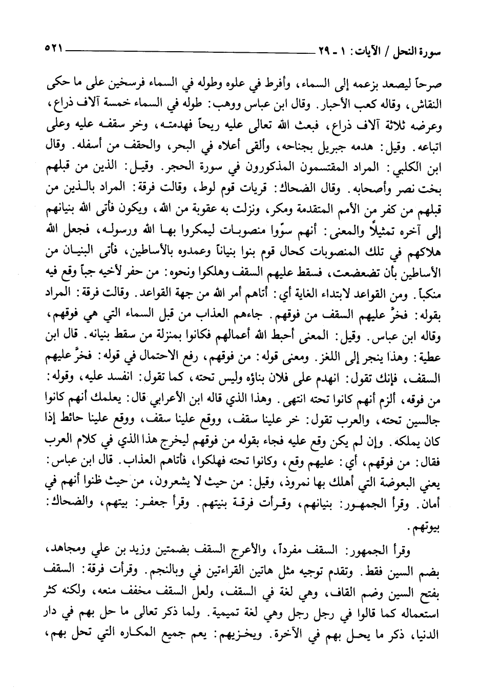 صَرْحًا لِيَصْعَدَ بِزَعْمِهِ إِلَى السَّمَاءِ، وَأَفْرَطَ فِي عُلُوِّهِ وَطُولِهِ فِي السَّمَاءِ فَرْسَخَيْنِ عَلَى مَا حَكَى النَّقَّاشُ، وَقَالَهُ كَعْبُ الْأَحْبَارِ. وَقَالَ ابْنُ عَبَّاسٍ وَوَهْبٌ: طَولُهُ فِي السَّمَاءِ خَمْسَةُ آلَافِ ذِرَاعٍ، وَعَرْضُهُ ثَلَاثَةُ آلَافِ ذِرَاعٍ، فَبَعَثَ اللَّهُ تَعَالَى عَلَيْهِ رِيحًا فَهَدَمَتْهُ، وَخَرَّ سَقْفُهُ عَلَيْهِ وَعَلَى أَتْبَاعِهِ. وَقِيلَ: هَدَمَهُ جِبْرِيلُ بِجَنَاحِهِ، وَأَلْقَى أَعْلَاهُ فِي الْبَحْرِ، وَالْحِقْفُ مِنْ أَسْفَلِهِ. وَقَالَ ابْنُ الْكَلْبِيِّ: الْمُرَادُ الْمُقْتَسِمُونَ الْمَذْكُورُونَ فِي سُورَةِ الْحِجْرِ. وَقِيلَ: الَّذِينَ مِنْ قَبْلِهِمْ بخت نصر وَأَصْحَابُهُ. وَقَالَ الضَّحَّاكُ: قُرَيَّاتُ قَوْمِ لُوطٍ، وَقَالَتْ فِرْقَةٌ: الْمُرَادُ بِالَّذِينِ مِنْ قَبْلِهِمْ مَنْ كَفَرَ مِنَ الْأُمَمِ الْمُتَقَدِّمَةِ وَمَكَرَ، وَنَزَلَتْ بِهِ عُقُوبَةٌ مِنَ اللَّهِ، وَيَكُونُ فَأَتَى اللَّهُ بُنْيَانَهُمْ إِلَى آخِرِهِ تَمْثِيلًا وَالْمَعْنَى: أَنَّهُمْ سَوَّوْا مَنْصُوبَاتٍ لِيَمْكُرُوا بِهَا اللَّهَ وَرَسُولَهُ، فَجَعَلَ اللَّهُ هَلَاكَهُمْ فِي تِلْكَ الْمَنْصُوبَاتِ كَحَالِ قَوْمٍ بَنَوْا بُنْيَانًا وَعَمَّدُوهُ بِالْأَسَاطِينِ، فَأَتَى الْبُنْيَانَ مِنَ الْأَسَاطِينِ بِأَنْ تَضَعْضَعَتْ، فَسَقَطَ عَلَيْهِمُ السَّقْفُ وَهَلَكُوا وَنَحْوُهُ: مَنْ حَفَرَ لِأَخِيهِ جُبًّا وَقَعَ فِيهِ مُنْكَبًّا. وَمِنَ الْقَوَاعِدِ لِابْتِدَاءِ الْغَايَةِ أَيْ: أَتَاهُمْ أَمْرُ اللَّهِ مِنْ جِهَةِ الْقَوَاعِدِ. وَقَالَتْ فِرْقَةٌ: الْمُرَادُ بِقَوْلِهِ: فَخَرَّ عَلَيْهِمُ السَّقْفُ مِنْ فَوْقِهِمْ. جَاءَهُمُ الْعَذَابُ مِنْ قِبَلِ السَّمَاءِ الَّتِي هِيَ فَوْقَهُمْ، وَقَالَهُ ابْنُ عَبَّاسٍ. وَقِيلَ: الْمَعْنَى أَحْبَطَ اللَّهُ أَعْمَالَهُمْ فَكَانُوا بِمَنْزِلَةِ مَنْ سَقَطَ بُنْيَانُهُ. قَالَ ابْنُ عَطِيَّةَ: وَهَذَا يَنْجَرُّ إِلَى اللُّغْزِ. وَمَعْنَى قَوْلِهِ: مِنْ فَوْقِهِمْ، رَفْعُ الِاحْتِمَالِ فِي قَوْلِهِ: فَخَرَّ عَلَيْهِمُ السَّقْفُ، فَإِنَّكَ تَقُولُ: انْهَدَمَ عَلَى فُلَانٍ بِنَاؤُهُ وَلَيْسَ تَحْتَهُ، كَمَا تَقُولُ: انْفَسَدَ عَلَيْهِ، وَقَوْلُهُ: