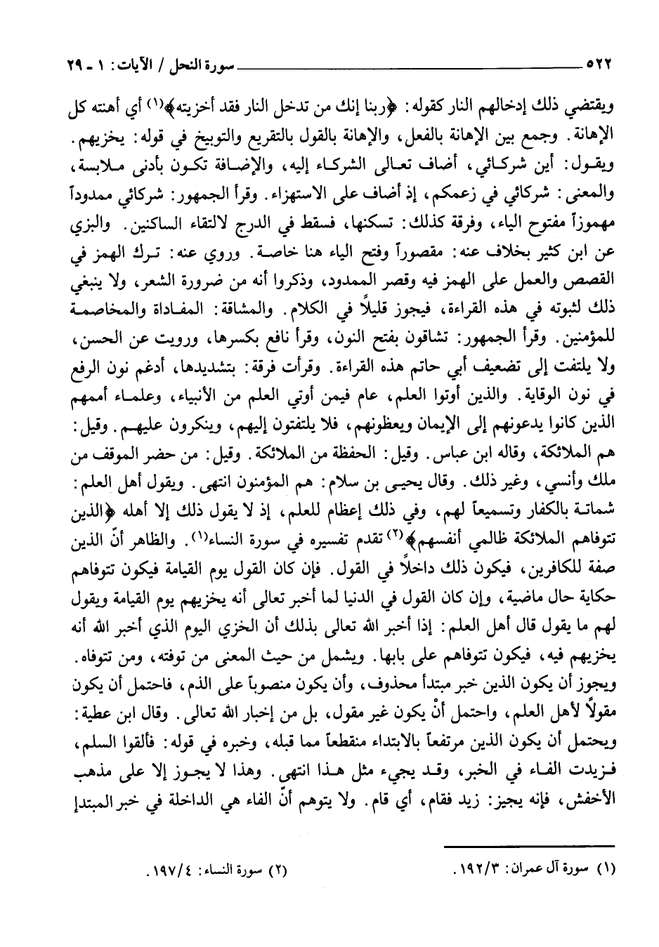 شَمَاتَةً بِالْكُفَّارِ وَتَسْمِيعًا لَهُمْ، وَفِي ذَلِكَ إِعْظَامٌ لِلْعِلْمِ، إِذْ لَا يَقُولُ ذَلِكَ إِلَّا أَهْلُهُ الَّذِينَ تَتَوَفَّاهُمُ الْمَلائِكَةُ ظالِمِي أَنْفُسِهِمْ «2» تَقَدَّمَ تَفْسِيرُهُ فِي سُورَةِ النِّسَاءِ «3» . وَالظَّاهِرُ أَنَّ الَّذِينَ صِفَةٌ لِلْكَافِرِينَ، فَيَكُونُ ذَلِكَ دَاخِلًا فِي الْقَوْلِ. فَإِنْ كَانَ الْقَوْلُ يَوْمَ الْقِيَامَةِ فَيَكُونُ تَتَوَفَّاهُمْ حكاية حال ماضية، وأن كَانَ الْقَوْلُ فِي الدُّنْيَا لَمَا أَخْبَرَ تَعَالَى أَنَّهُ يُخْزِيهِمْ يَوْمَ الْقِيَامَةِ وَيَقُولُ لَهُمْ مَا يَقُولُ قَالَ أَهْلُ الْعِلْمِ: إِذَا أَخْبَرَ اللَّهُ تَعَالَى بِذَلِكَ أَنَّ الْخِزْيَ الْيَوْمَ الَّذِي أَخْبَرَ اللَّهُ أَنَّهُ يُخْزِيهِمْ فِيهِ، فَيَكُونُ تَتَوَفَّاهُمْ عَلَى بَابِهَا. وَيَشْمَلُ مِنْ حَيْثُ الْمَعْنَى مِنْ تَوَفَّتْهُ، وَمَنْ تَتَوَفَّاهُ.