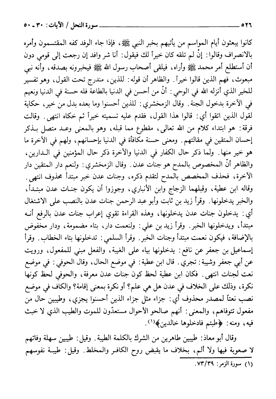 كَانُوا يَبْعَثُونَ أَيَّامَ الْمَوَاسِمِ مَنْ يَأْتِيهِمْ بِخَبَرِ النَّبِيِّ صَلَّى اللَّهُ عَلَيْهِ وَسَلَّمَ، فَإِذَا جَاءَ الْوَفْدُ كَفَّهُ الْمُقْتَسِمُونَ وَأَمَرَهُ بِالِانْصِرَافِ وَقَالُوا: إِنْ لَمْ تَلْقَهُ كَانَ خَيْرًا لَكَ فَيَقُولُ: أَنَا شَرُّ وَافِدٍ إِنْ رَجَعْتُ إِلَى قَوْمِي دُونَ أَنْ أَسْتَطْلِعَ أَمْرِ مُحَمَّدٍ صَلَّى اللَّهُ عَلَيْهِ وَسَلَّمَ وَأَرَاهُ، فَيَلْقَى أَصْحَابَ رَسُولِ اللَّهِ صَلَّى اللَّهُ عَلَيْهِ وَسَلَّمَ فَيُخْبِرُونَهُ بِصِدْقِهِ، وَأَنَّهُ نَبِيٌّ مَبْعُوثٌ، فَهُمُ الَّذِينَ قَالُوا خَيْرًا. وَالظَّاهِرُ أَنَّ قَوْلَهُ: لِلَّذِينَ، مُنْدَرِجٌ تَحْتَ الْقَوْلِ، وَهُوَ تَفْسِيرٌ لِلْخَيْرِ الَّذِي أنزله اللَّهُ فِي الْوَحْيِ: أَنَّ مَنْ أَحْسَنَ فِي الدُّنْيَا بِالطَّاعَةِ فَلَهُ حَسَنَةٌ فِي الدُّنْيَا وَنَعِيمٌ فِي الْآخِرَةِ بِدُخُولِ الْجَنَّةِ. وَقَالَ الزَّمَخْشَرِيُّ: لِلَّذِينِ أَحْسَنُوا وَمَا بَعْدَهُ بَدَلٌ مِنْ خَيْرٍ، حِكَايَةً لِقَوْلِ الَّذِينَ اتَّقَوْا أَيْ: قَالُوا هَذَا الْقَوْلَ، فَقَدَّمَ عَلَيْهِ تَسْمِيَتَهُ خَيْرًا ثُمَّ خكاه انْتَهَى. وَقَالَتْ فِرْقَةٌ: هُوَ ابْتِدَاءُ كَلَامٍ مِنَ اللَّهِ تَعَالَى، مَقْطُوعٌ مِمَّا قَبْلَهُ، وَهُوَ بِالْمَعْنَى وَعْدٌ مُتَّصِلٌ بِذِكْرِ إِحْسَانِ الْمُتَّقِينَ فِي مَقَالَتِهِمْ. وَمَعْنَى حَسَنَةٍ مُكَافَأَةٌ فِي الدُّنْيَا بِإِحْسَانِهِمْ، وَلَهُمْ فِي الْآخِرَةِ مَا هُوَ خَيْرٌ مِنْهَا. وَلَمَّا ذَكَرَ حَالَ الْكُفَّارِ فِي الدُّنْيَا وَالْآخِرَةِ ذَكَرَ حَالَ الْمُؤْمِنِينَ فِي الدَّارَيْنِ، وَالظَّاهِرُ أَنَّ الْمَخْصُوصَ بِالْمَدْحِ هُوَ جَنَّاتُ عَدْنٍ. وَقَالَ الزَّمَخْشَرِيُّ: وَلَنِعْمَ دَارُ الْمُتَّقِينَ دَارُ الْآخِرَةِ، فَحَذَفَ الْمُخَصَّصَ بِالْمَدْحِ لِتَقَدُّمِ ذِكْرِهِ، وَجَنَّاتُ عَدْنٍ خَبَرُ مُبْتَدَأٍ مَحْذُوفٍ انْتَهَى.
