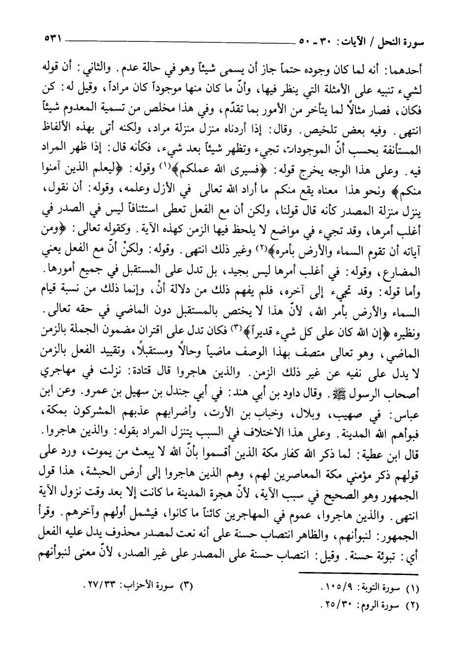 ونظيره كانَ اللَّهُ عَلى كُلِّ شَيْءٍ قَدِيراً «3» فَكَانَ تَدُلُّ عَلَى اقْتِرَانِ مَضْمُونِ الْجُمْلَةِ بِالزَّمَنِ الْمَاضِي، وَهُوَ تَعَالَى مُتَّصِفٌ بِهَذَا الْوَصْفِ مَاضِيًا وَحَالًا وَمُسْتَقْبَلًا، وَتَقْيِيدُ الْفِعْلِ بِالزَّمَنِ لَا يَدُلُّ عَلَى نَفْيِهِ عَنْ غَيْرِ ذَلِكَ الزَّمَنِ. وَالَّذِينَ هَاجَرُوا قَالَ قَتَادَةُ: نَزَلَتْ فِي مُهَاجِرِي أَصْحَابِ الرَّسُولِ صَلَّى اللَّهُ عليه وَسَلَّمَ. وَقَالَ دَاوُدُ بْنُ أَبِي هِنْدَ: فِي أَبِي جَنْدَلِ بْنِ سُهَيْلِ بْنِ عَمْرٍو. وَعَنِ ابْنِ عَبَّاسٍ: فِي صُهَيْبٍ، وَبِلَالٍ، وَخَبَّابِ بْنِ الْأَرَتِّ، وَأَضْرَابِهِمْ عَذَّبَهُمُ الْمُشْرِكُونَ بِمَكَّةَ، فَبَوَّأَهُمُ اللَّهُ الْمَدِينَةَ. وَعَلَى هَذَا الِاخْتِلَافِ فِي السَّبَبِ يَتَنَزَّلُ الْمُرَادُ بِقَوْلِهِ: وَالَّذِينَ هَاجَرُوا.