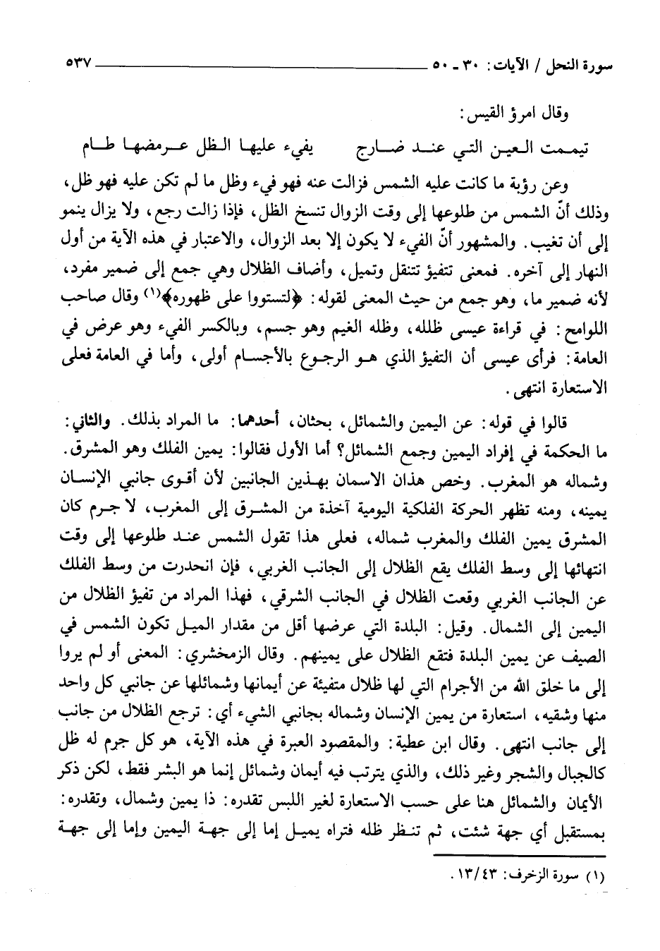 وَشِمَالُهُ هُوَ الْمَغْرِبُ. وَخَصَّ هَذَانِ الِاسْمَانِ بِهَذَيْنِ الْجَانِبَيْنِ لِأَنَّ أَقْوَى جَانِبَيِ الْإِنْسَانِ يَمِينُهُ، وَمِنْهُ تَظْهَرُ الْحَرَكَةُ الْفَلَكِيَّةُ الْيَوْمِيَّةُ آخِذَةً مِنَ الْمَشْرِقِ إِلَى الْمَغْرِبِ، لَا جَرَمَ كَانَ الْمَشْرِقُ يَمِينَ الْفَلَكِ وَالْمَغْرِبُ شِمَالَهُ، فَعَلَى هَذَا تَقُولُ الشَّمْسُ عِنْدَ طُلُوعِهَا إِلَى وَقْتِ انْتِهَائِهَا إِلَى وَسَطِ الْفَلَكِ يَقَعُ الظِّلَالُ إِلَى الْجَانِبِ الْغَرْبِيِّ، فَإِنِ انْحَدَرَتْ مِنْ وَسَطِ الْفَلَكِ عَنِ الْجَانِبِ الْغَرْبِيِّ وَقَعَتِ الظِّلَالُ فِي الْجَانِبِ الشَّرْقِيِّ، فَهَذَا الْمُرَادُ مِنْ تَفَيُّؤِ الظِّلَالِ من اليمين إلى الشمال. وَقِيلَ: الْبَلْدَةُ الَّتِي عَرْضُهَا أَقَلُّ مِنْ مِقْدَارِ الْمِيلِ تَكُونُ الشَّمْسُ فِي الصَّيْفِ عَنْ يَمِينِ الْبَلْدَةِ فَتَقَعُ الظِّلَالُ عَلَى يَمِينِهِمْ. وَقَالَ الزمخشري: المعنى أَوْ لَمْ يَرَوْا إِلَى مَا خَلَقَ اللَّهُ مِنَ الْأَجْرَامِ الَّتِي لَهَا ظِلَالٌ مُتَفَيِّئَةٌ عَنْ أَيْمَانِهَا وَشَمَائِلِهَا عَنْ جَانِبَيْ كُلِّ وَاحِدٍ مِنْهَا وَشِقَّيْهِ، اسْتِعَارَةٌ مِنْ يَمِينِ الْإِنْسَانِ وَشِمَالِهِ بِجَانِبَيِ الشَّيْءِ أَيْ: تَرْجِعُ الظِّلَالُ مِنْ جَانِبٍ إِلَى جَانِبٍ انْتَهَى. وَقَالَ ابْنُ عَطِيَّةَ: وَالْمَقْصُودُ الْعِبْرَةُ فِي هَذِهِ الْآيَةِ، هُوَ كُلُّ جِرْمٍ لَهُ ظِلٌّ كَالْجِبَالِ وَالشَّجَرِ وَغَيْرِ ذَلِكَ، وَالَّذِي يَتَرَتَّبُ فِيهِ أَيْمَانٌ وَشَمَائِلُ إِنَّمَا هُوَ الْبَشَرُ فَقَطْ، لَكِنَّ ذِكْرَ الْأَيْمَانِ وَالشَّمَائِلِ هُنَا عَلَى حَسْبِ الِاسْتِعَارَةِ لِغَيْرِ اللَّبْسِ تُقَدِّرُهُ: ذَا يَمِينِ وَشِمَالٍ، وَتُقَدِّرُهُ: